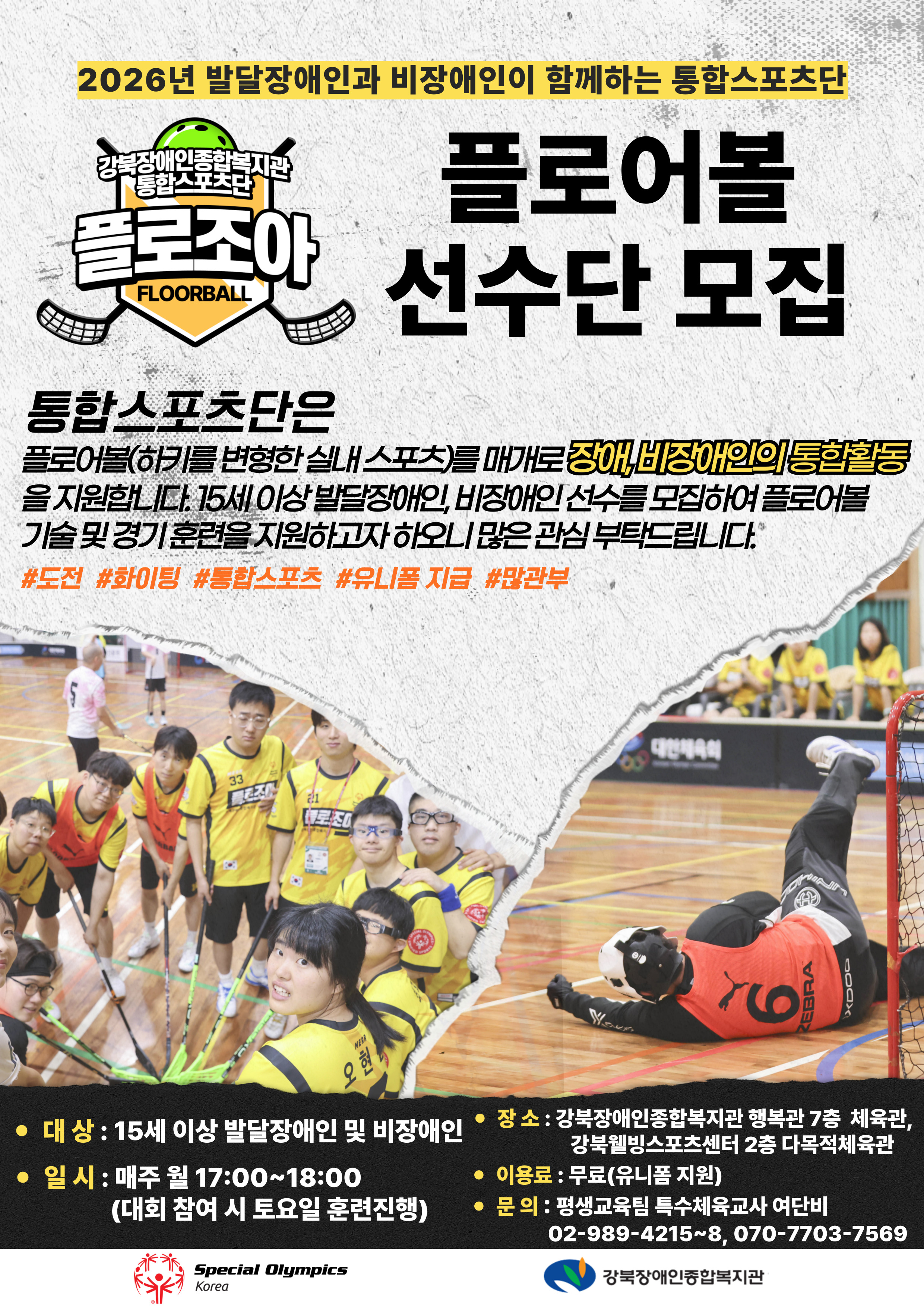 강북장애인종합복지관에서는 플로어볼을 매개로 장애인과 비장애인이 함께 참여하는 통합스포츠단을 운영하고 있으며,