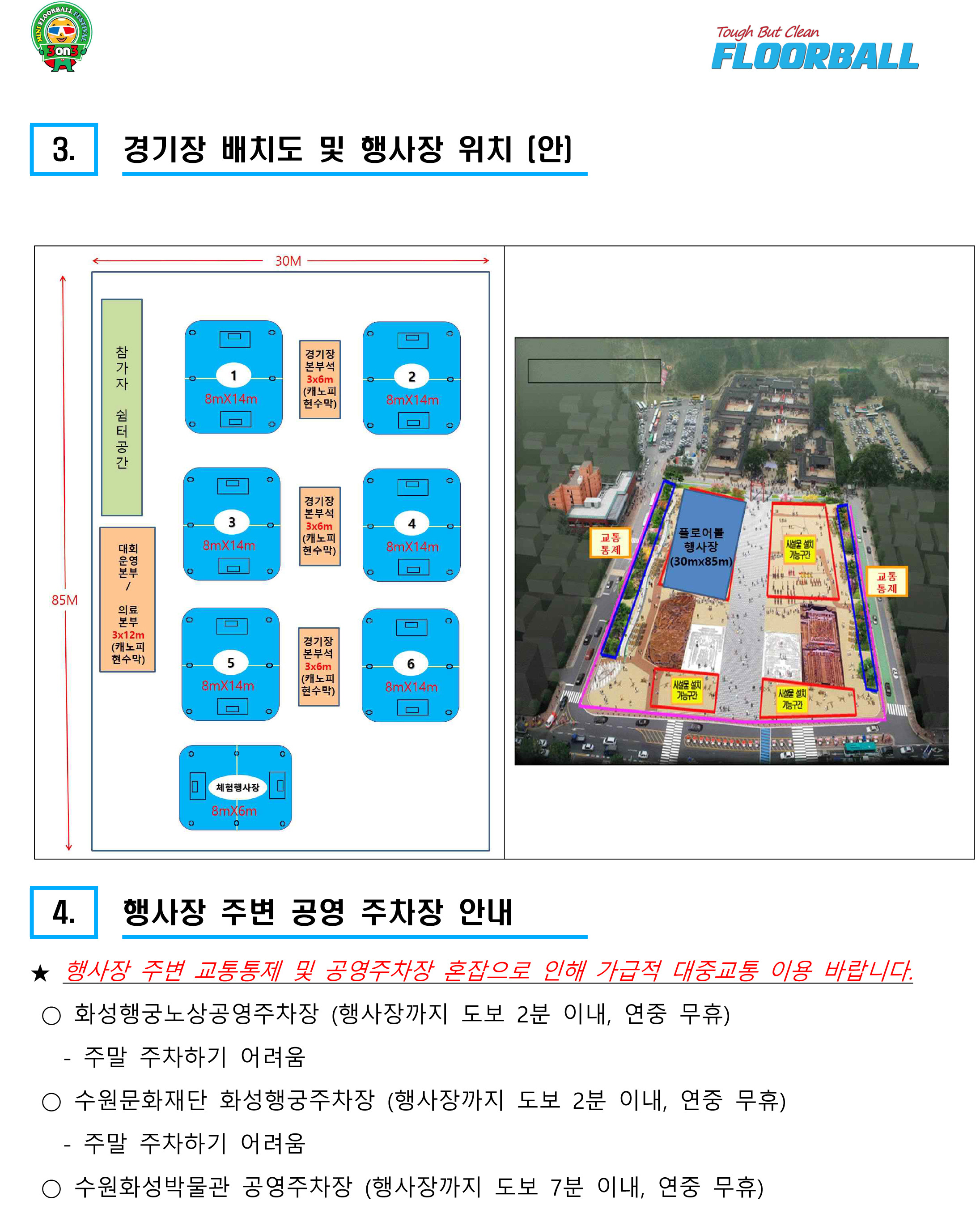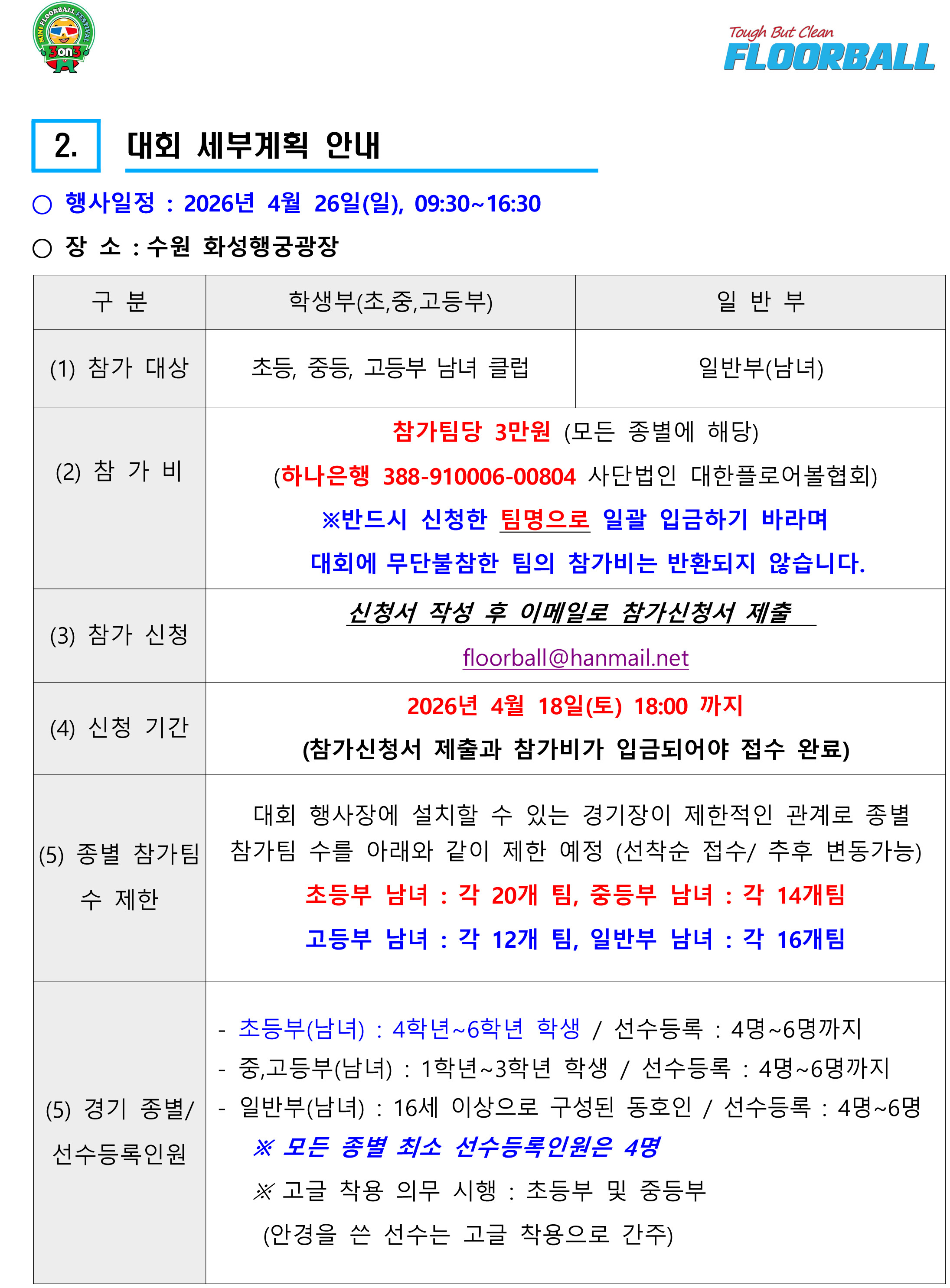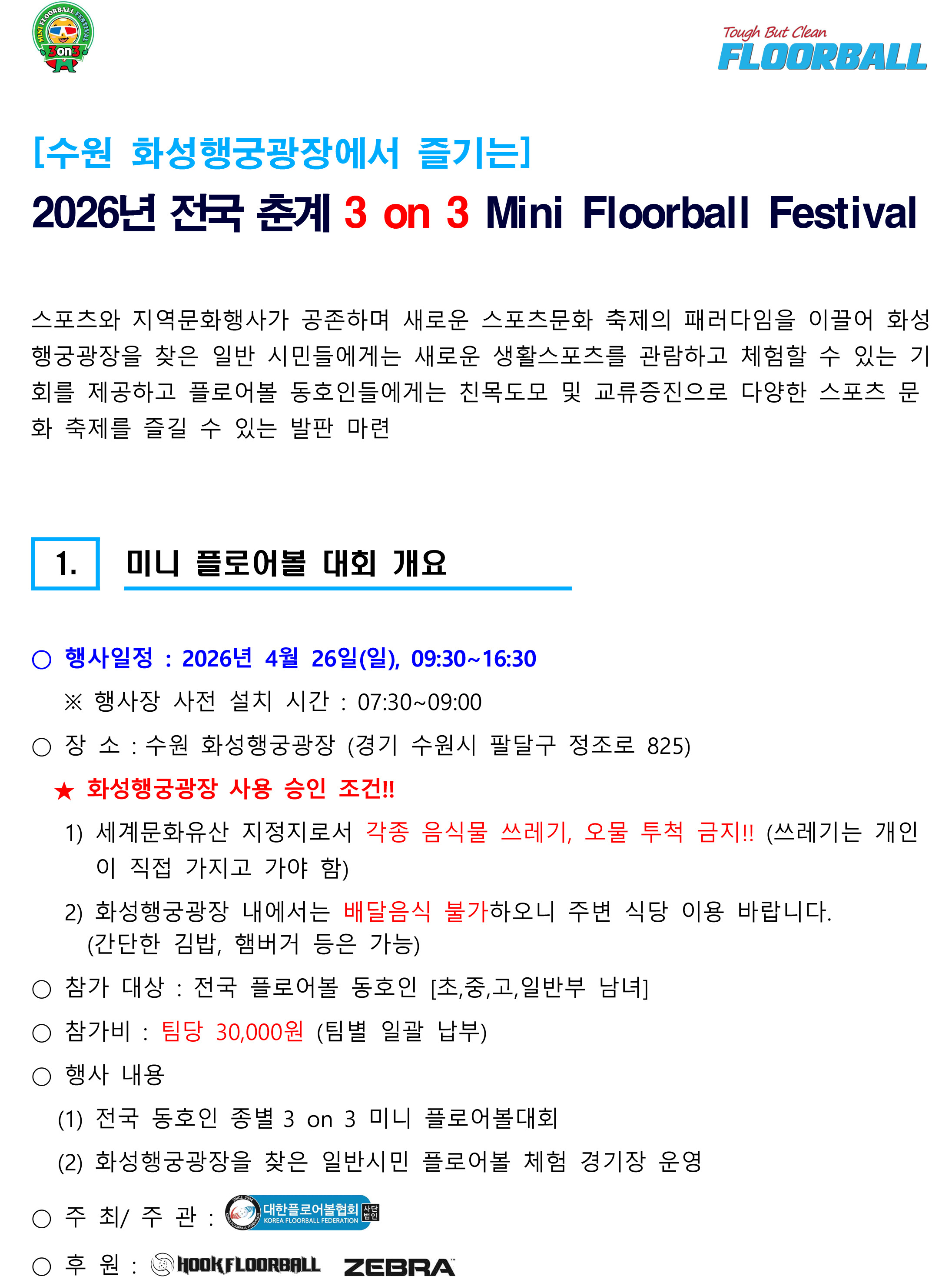 2026년 전국 춘계 3 on 3 미니 플로어볼 페스티벌 개최 알림(4월 26일, 수원화성행궁광장) 작성자floorball|작성시간26.03.16|조회수131 목록 댓글 0 글자크기 작게가 글자크기 크게가 [협조 공문] 2026년 전국 춘계 3 on 3 미니 플로어볼 페스티벌 개최 알림-공문.pdf140.52KB[붙임 1. 2026년 전국 춘계 미니게임 세부계획서] 붙임 1. 2026년 전국 춘계 미니게임 세부계획서.pdf648.05KB [붙임 2. 미니게임 참가신청서] 붙임 2. 미니게임_참가신청서(2026년-4월 26일_수원 화성행궁광장).hwp1.08MB 첨부파일첨부된 파일이 7개 있습니다. jpg 파일 붙임 2.jpg 다운로드 jpg 파일 붙임 3.jpg 다운로드 jpg 파일 붙임 1.jpg 다운로드 jpg 파일 붙임 4.jpg 다운로드 pdf 파일 2026년 전국 춘계 3 on 3 미니 플로어볼 페스티벌 개최 알림-공문.pdf 다운로드 pdf 파일 붙임 1. 2026년 전국 춘계 미니게임 세부계획서.pdf 다운로드 hwp 파일 붙임 2. 미니게임_참가신청서(2026년-4월 26일_수원 화성행궁광장).hwp 다운로드 다음검색 현재 게시글 추가 기능 열기 북마크 공유하기 신고 센터로 신고 댓글 댓글 0 댓글쓰기 답글쓰기 댓글 리스트