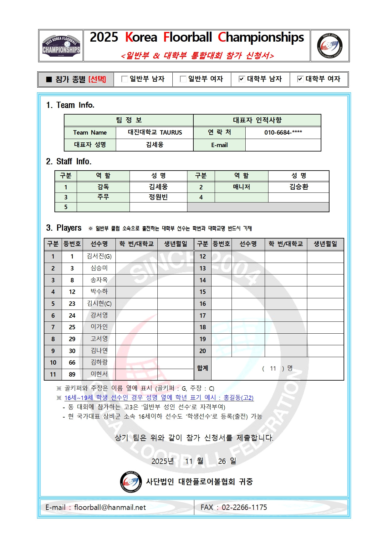 [여자부-6] 2025 Korea Floorball Championships (일반부&대학부 통합)- 대진대학교 TAURUS 작성자floorball|작성시간25.11.26|조회수101 목록 댓글 0 글자크기 작게가 글자크기 크게가 다음검색 현재 게시글 추가 기능 열기 북마크 공유하기 신고 센터로 신고 댓글 댓글 0 댓글쓰기 답글쓰기 댓글 리스트