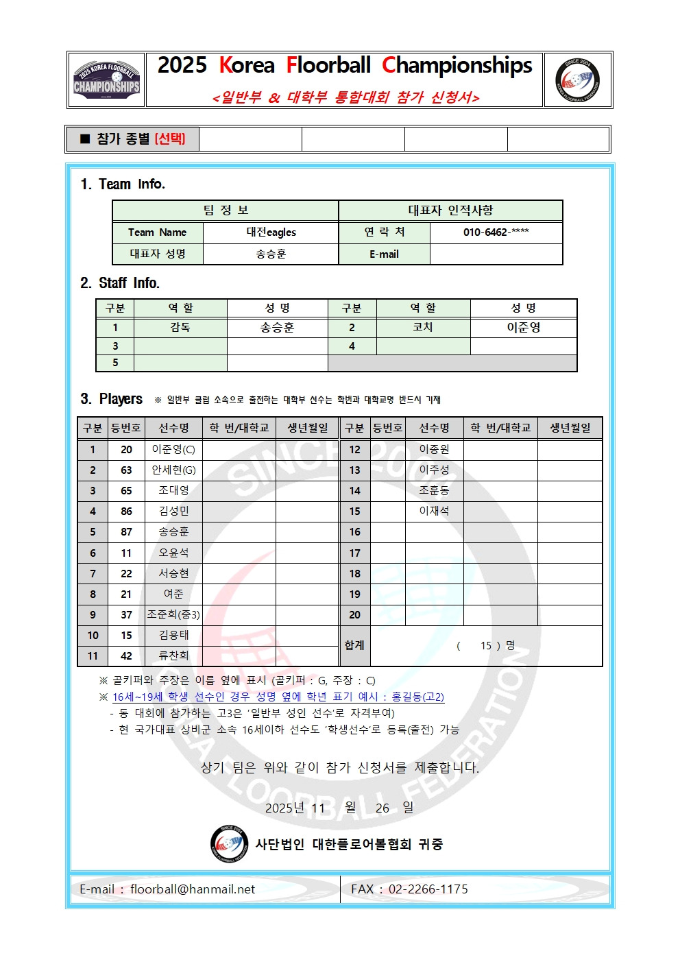 [남자부-12] 2025 Korea Floorball Championships (일반부&대학부 통합)- 대전이글스 작성자floorball|작성시간25.11.26|조회수106 목록 댓글 0 글자크기 작게가 글자크기 크게가 다음검색 현재 게시글 추가 기능 열기 북마크 공유하기 신고 센터로 신고 댓글 댓글 0 댓글쓰기 답글쓰기 댓글 리스트