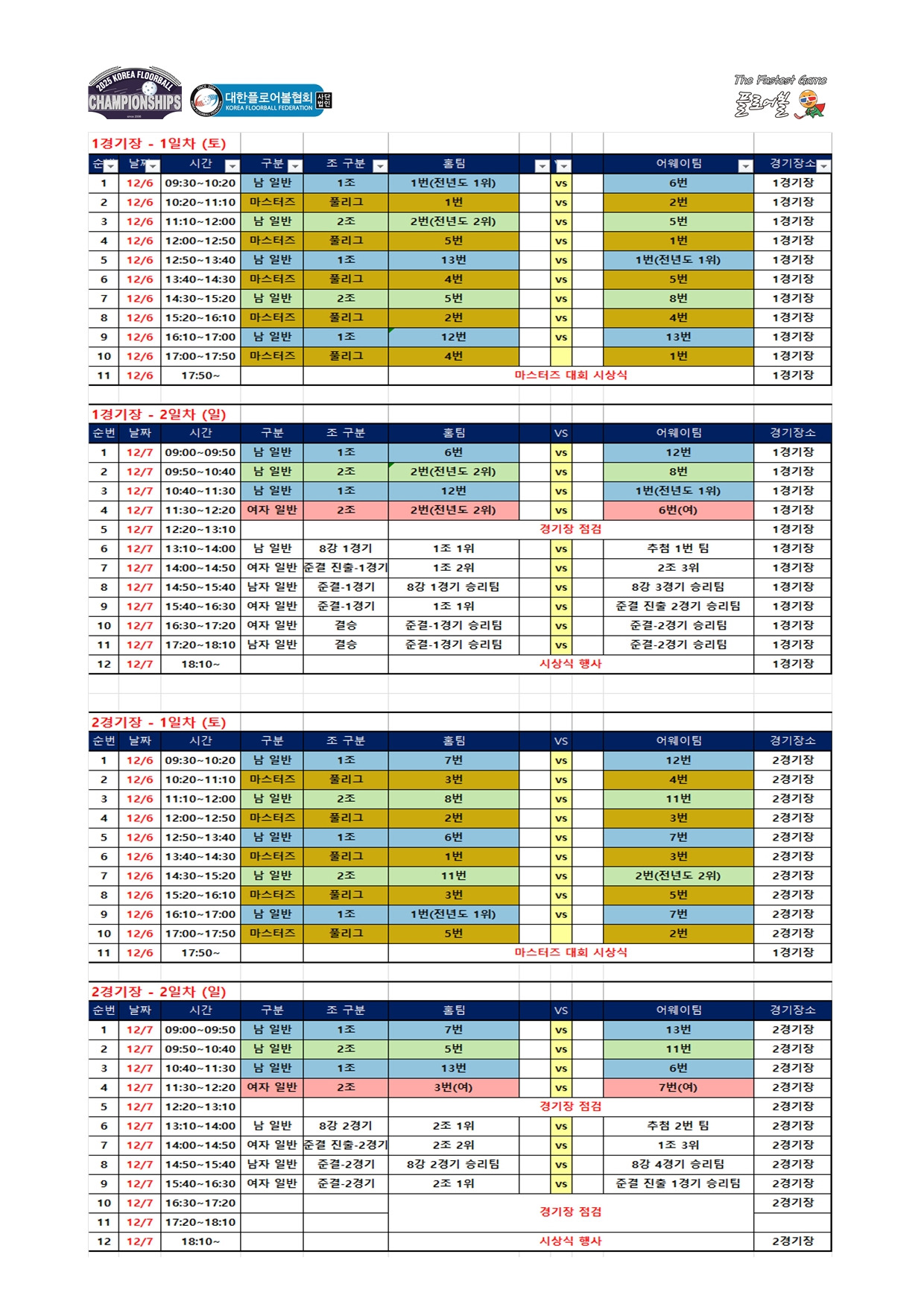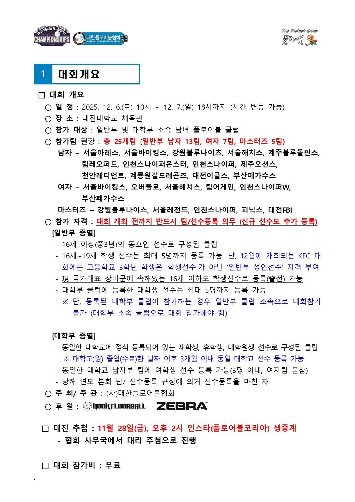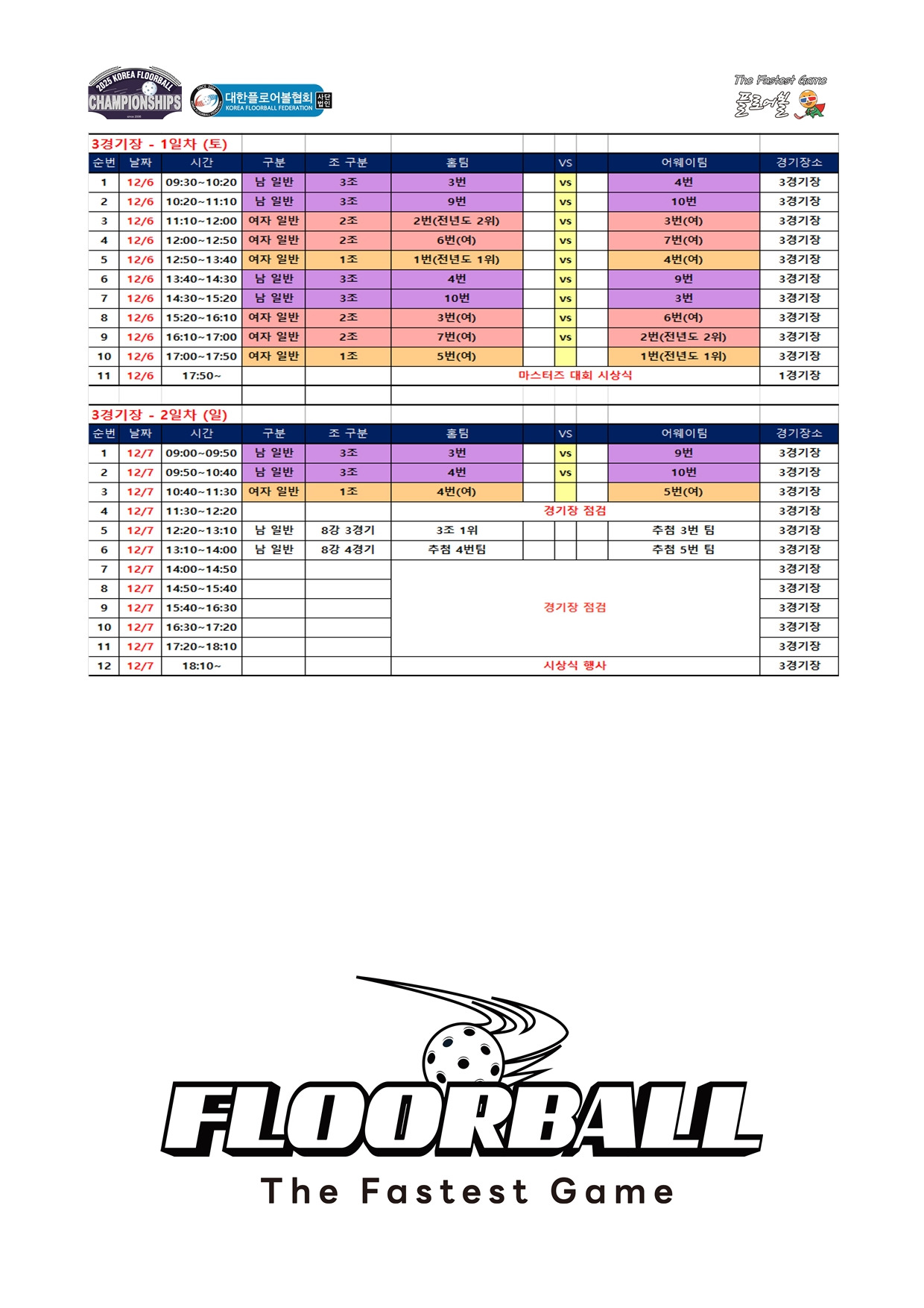 2025 Korea Floorball Championships (일반부&대학부 통합) 대회 사전 경기대진표/ 대진추첨 안내 작성자floorball|작성시간25.11.27|조회수293 목록 댓글 0 글자크기 작게가 글자크기 크게가 다음검색 현재 게시글 추가 기능 열기 북마크 공유하기 신고 센터로 신고 댓글 댓글 0 댓글쓰기 답글쓰기 댓글 리스트