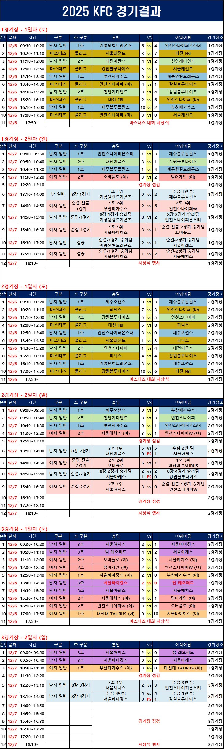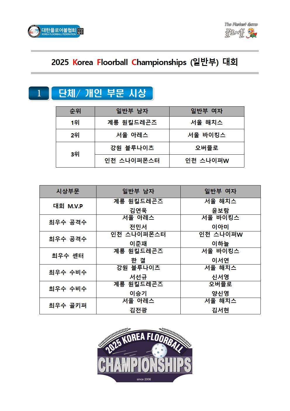 2025 Korea Floorball Championships 대회 경기결과 및 시상 작성자floorball|작성시간25.12.09|조회수184 목록 댓글 0 글자크기 작게가 글자크기 크게가 다음검색 현재 게시글 추가 기능 열기 북마크 공유하기 신고 센터로 신고 댓글 댓글 0 댓글쓰기 답글쓰기 댓글 리스트