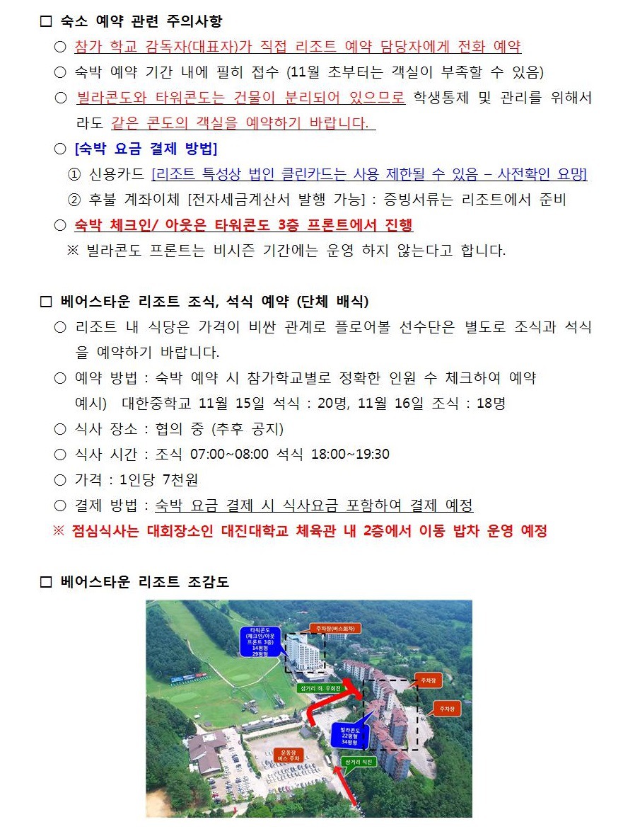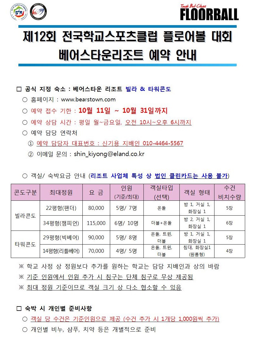 2019년 제12회 전국학교스포츠클럽대회 베어스타운리조트 공식 숙소 예약 안내 (10월11일~10월31일까지)