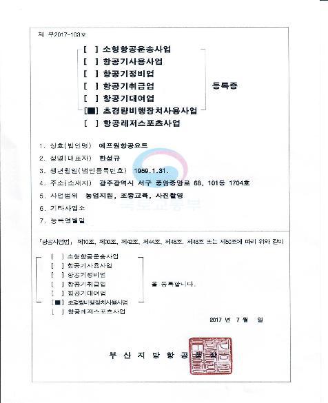 ② 에프원항공요트 (http://cafe.daum.net/flower-yt) ○ 주소 : 전남해남군 삼산면 상가길 46-6 ○ 대표 : 한성규 (010-3604-8655) ○ 사업자번호 : 338-72-00130 ○ 초경량비행장치사용사업 : 제2017-130호 [6039] ○ 기타자유업 : 전남해남제338-72-00130호 [9999] ○ 소프트웨어사업자(써비스업) : 제B17-143160호 [1468] ○ 초경량비행장치 : 제부2017-342호 [보성빔인터네셔널/BB15A-2017050005] 제Ⅲ장 사업추진일정 계획 1. 사업수행 예정공정표 가, 사업 추진 절차(안)
