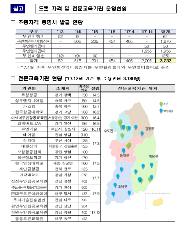 1. 국토교통부 보도자료 (2017.12.22) -. 국토부, 드론산업 규모 5년내 20배 육성위한 종합계획 발표 -. 드론산업 발전 기본계획[안] 정부관계부처 합동 (2017~2026) 2. 항공안전법 관련 법규 -. 초경량비행장치 조종자 전문교육기관의 지정 관련법규 -. 항공교육훈련 포털 (드론교육기관 LIST)