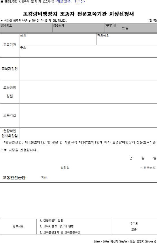 제307조(초경량비행장치 조종자 전문교육기관의 지정 등) ① 법 제126조제1항에 따른 초경량비행장치 조종자 전문교육기관으로 지정받으려는 자는 별지 제120호서식의 초경량비행장치 조종자 전문교육기관 지정신청서에 다음 각 호의 사항을 적은 서류를 첨부하여 교통안전공단에 제출하여야 한다. <개정 2017.11.10> 1. 전문교관의 현황 2. 교육시설 및 장비의 현황 3. 교육훈련계획 및 교육훈련규정 ② 법 제126조제3항에 따른 초경량비행장치 조종자 전문교육기관의 지정기준은 다음 각 호와 같다. 1. 다음 각 목의 전문교관이 있을 것 가. 비행시간이 200시간(무인비행장치의 경우 조종경력이 100시간)이상이고, 국토교통부장관이 인정한 조종교육교관과정을 이수한 지도조종자 1명 이상 나. 비행시간이 300시간(무인비행장치의 경우 조종경력이 150시간)이상이고 국토교통부장관이 인정하는 실기평가과정을 이수한 실기평가조종자 1명 이상 2. 다음 각 목의 시설 및 장비(시설 및 장비에 대한 사용권을 포함한다)를 갖출 것 가. 강의실 및 사무실 각 1개 이상 나. 이륙·착륙 시설 다. 훈련용 비행장치 1대 이상 3. 교육과목, 교육시간, 평가방법 및 교육훈련규정 등 교육훈련에 필요한 사항으로서 국토교통부장관이 정하여 고시하는 기준을 갖출 것 ③ 교통안전공단은 제1항에 따라 초경량비행장치 조종자 전문교육기관 지정신청서를 제출한 자가 제2항에 따른 기준에 적합하다고 인정하는 경우에는 별지 제121호 서식의 초경량비행장치 조종자 전문교육기관 지정서를 발급하여야 한다. <개정 2017.11.10 >