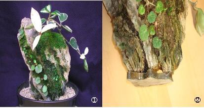 사진-(1)은 언젠가 올렸던 호야 석부작으로 입석의 굴곡부에 호야를 고정시킬 코일 또는 알미늄 철사를 강력접착제로 붙인 다음 수태와 흙을 섞은 생명토를 만들어 붙이고 호야를 고정시킨 후 다시 생명토를 덮고 그 위에 이끼를 덮어 씌운 다음 흙과 이끼가 흘러내리지 않도록 가는 철사로 Staples("ㄷ" 자 또는 "U"자)을 만들어 꽂아 놓으면 이끼가 번식하여 수반의 물을 흡입하게 되고 수분의 증발을 억제하게 됩니다. 사진-(1)-② 좌대는 호마이카와 경화제만으로 만든 것입니다.