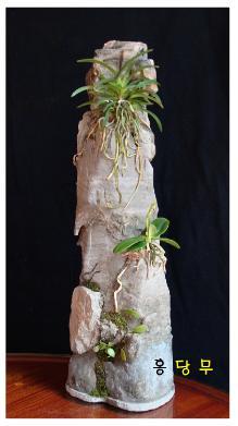 맨 위는 소엽풍란, 가운데는 대엽풍란 밑에는 콩란으로 바닦의 작은 구멍 속으로 줄기를 집어넣고 뒷면 동전 크기의 구멍을 통하여 수태를 넣어 콩란의 수분공급이 원활하도록 하였습니다.