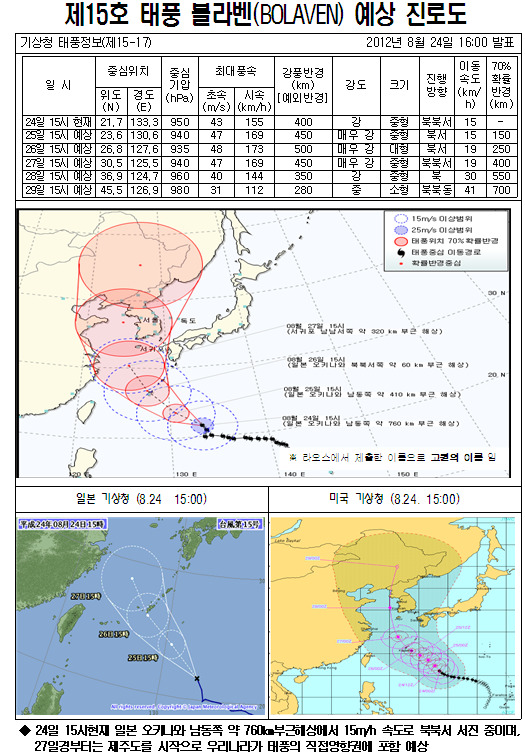 제15호 태풍 볼라벤(BOLAVEN) 예상 진로도 작성자후엥기|작성시간12.08.24|조회수167 목록 댓글 1 글자크기 작게가 글자크기 크게가 다음검색 현재 게시글 추가 기능 열기 북마크 공유하기 신고 센터로 신고 댓글 댓글 1 댓글쓰기 답글쓰기 댓글 리스트 작성자이른아침 | 작성시간 12.08.25 우리나라도 직접영향권에 포함되있다니 걱정입니다...태풍이 다른나라로 가기를 간절히바래요... 댓글 전체보기