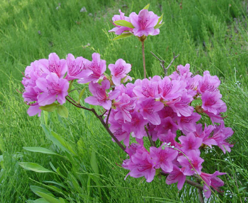 철쭉꽃은 전국의 계곡이나 높은 산 능선에 분포하는데 잎이 꽃보다 먼저 나고 잎 모양은 긴 타원형이며