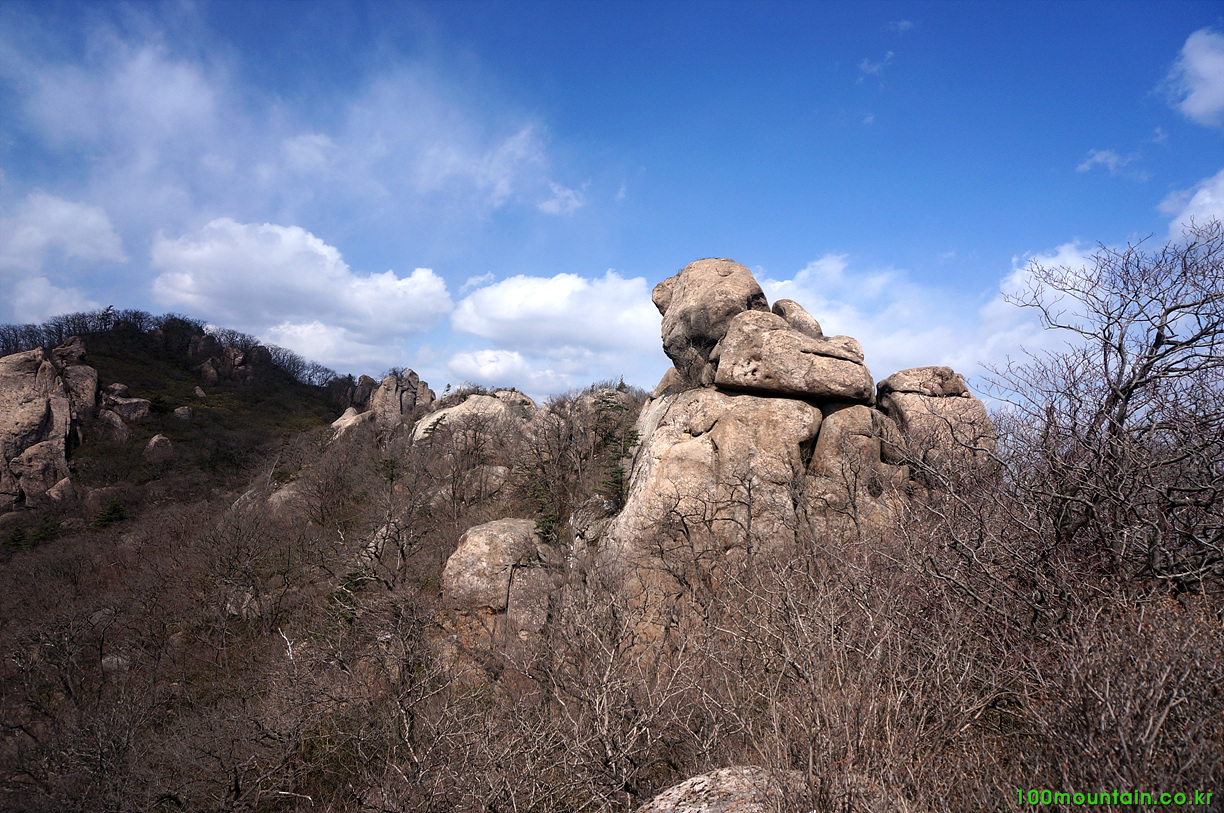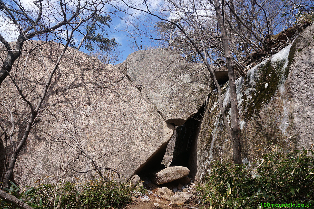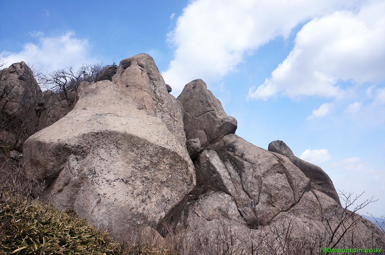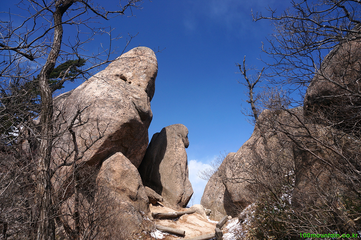 등산로 옆으로 바위가 마치 서 있는 듯 모습을 한게 있어요