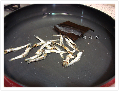멸치다시마물: 멸치 6개 정도, 다시마 5cm 1조각, 물 3~4컵
