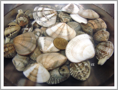1, 바지락과 생합은 물에 담가 충분히 해감을 시켜요..이때 철제품을 물속에 함께 넣어주면해감이 잘된다네요. 저는 10원짜리 동전 넣어봤어요)