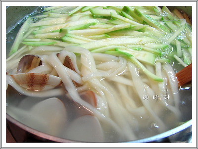 5,멸치육수에 생국수 넣고 삶다가 국수가 거의 익어갈 즈음 호박채를 넣습니다.