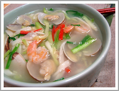 일단 조개만 넣어서 삶은 다음 알맹이를 꺼내고 국물을 한 접시 덜어내서 그 국물에 알맹이를