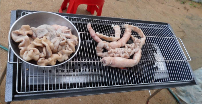 석쇠에 곱창을 올려서 초벌구이를 해줍니다..