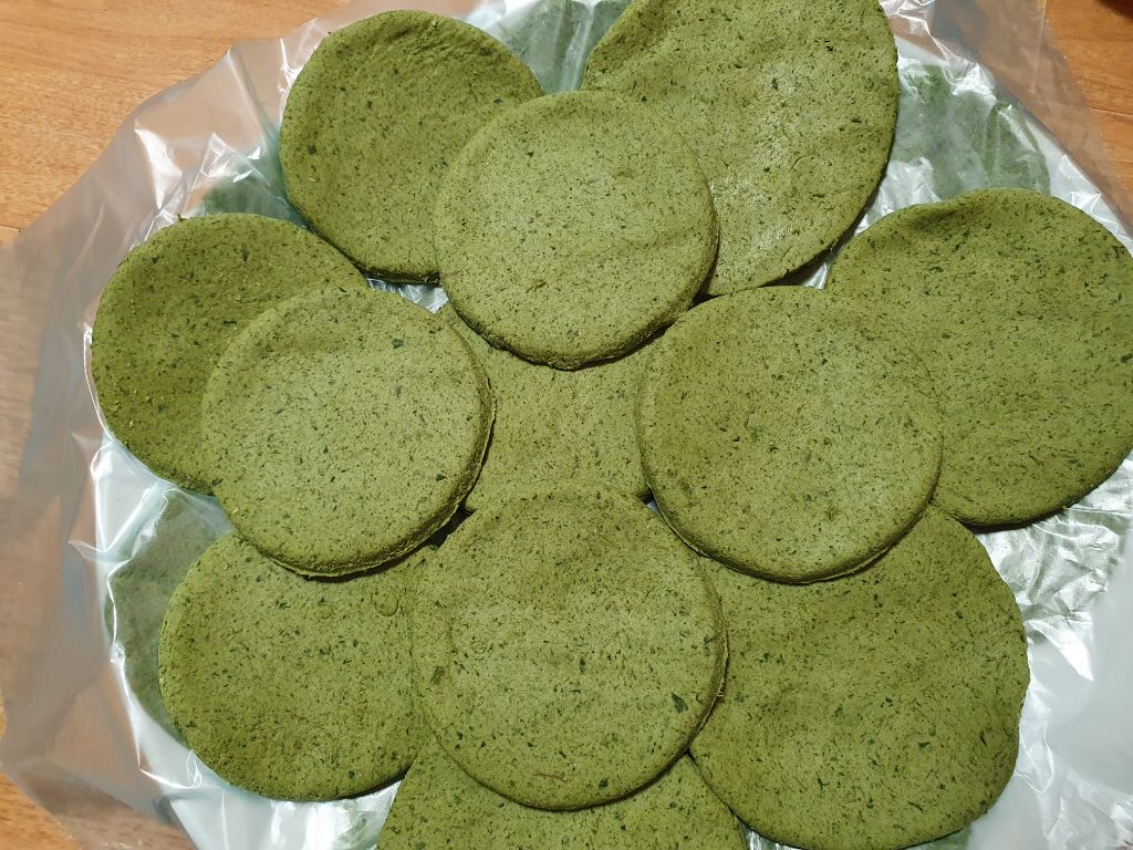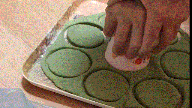 밀대로 밀어 컵으로 찍어냅니다.