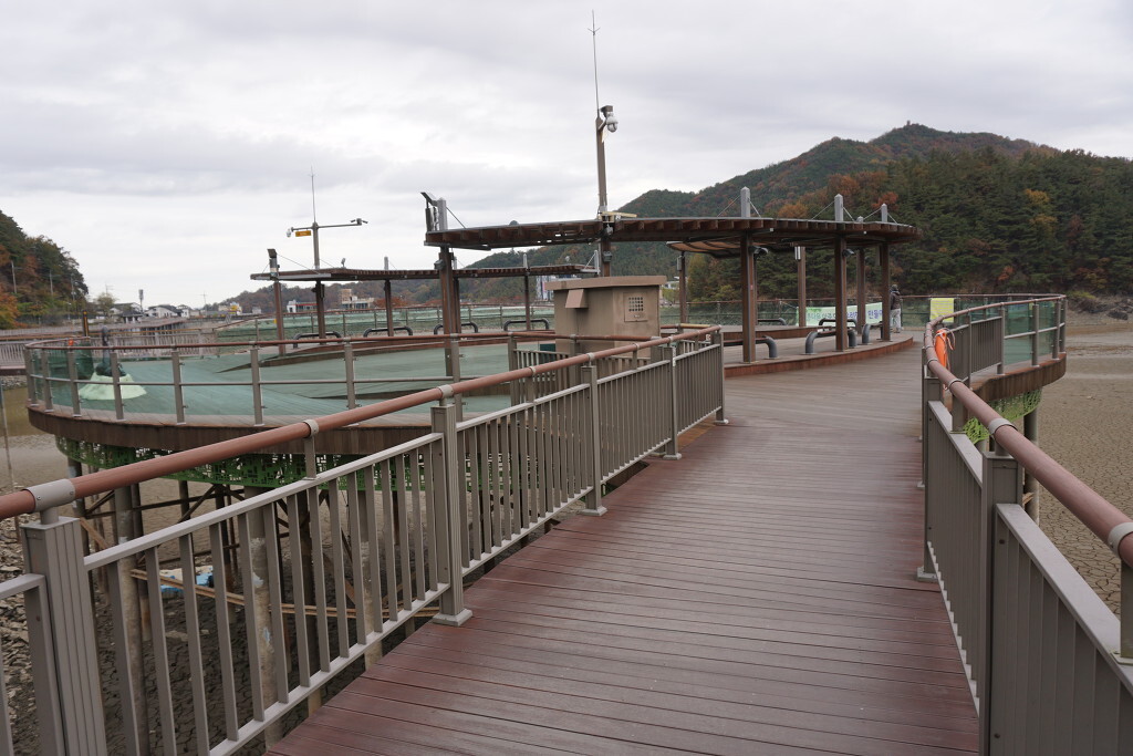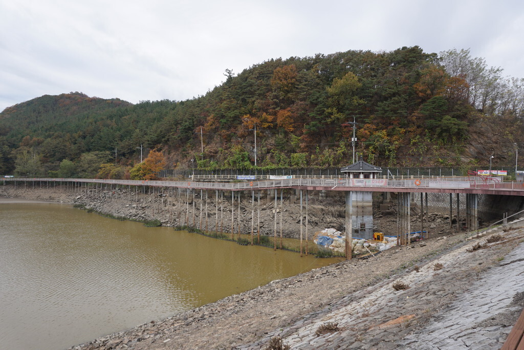깔끔하게 단장된 데크 산책로길...그런데 물로 가득해야할 저수지는 바닦을 들어낸채 험한 속살을 보