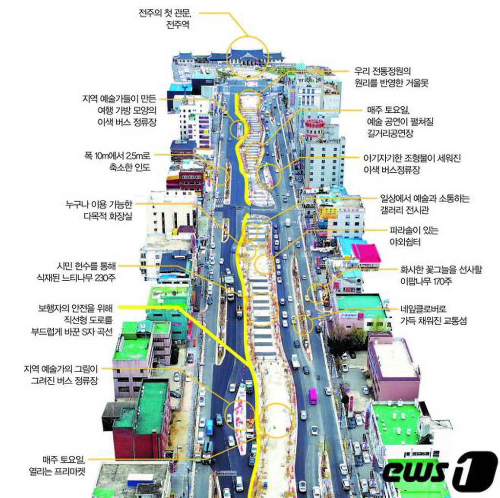 전주역 앞에서 명주골사거리까지 백제대로를 기존 8차선을 6차선으로 줄이고 직선도로를 S자형 곡선도로로 만든 첫마중길로 조성했다.