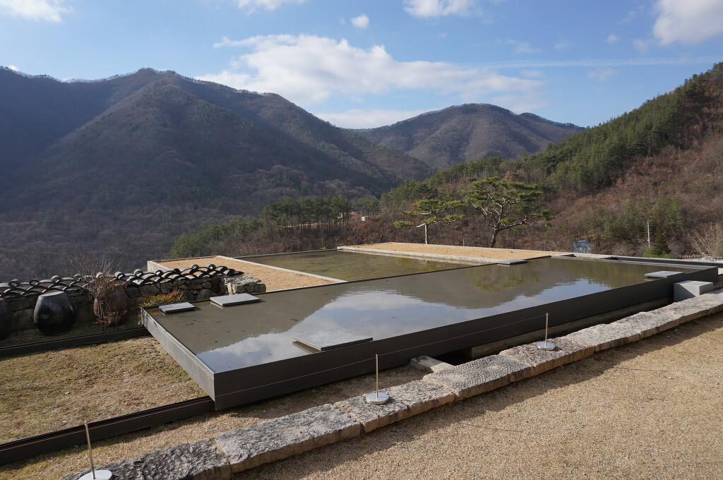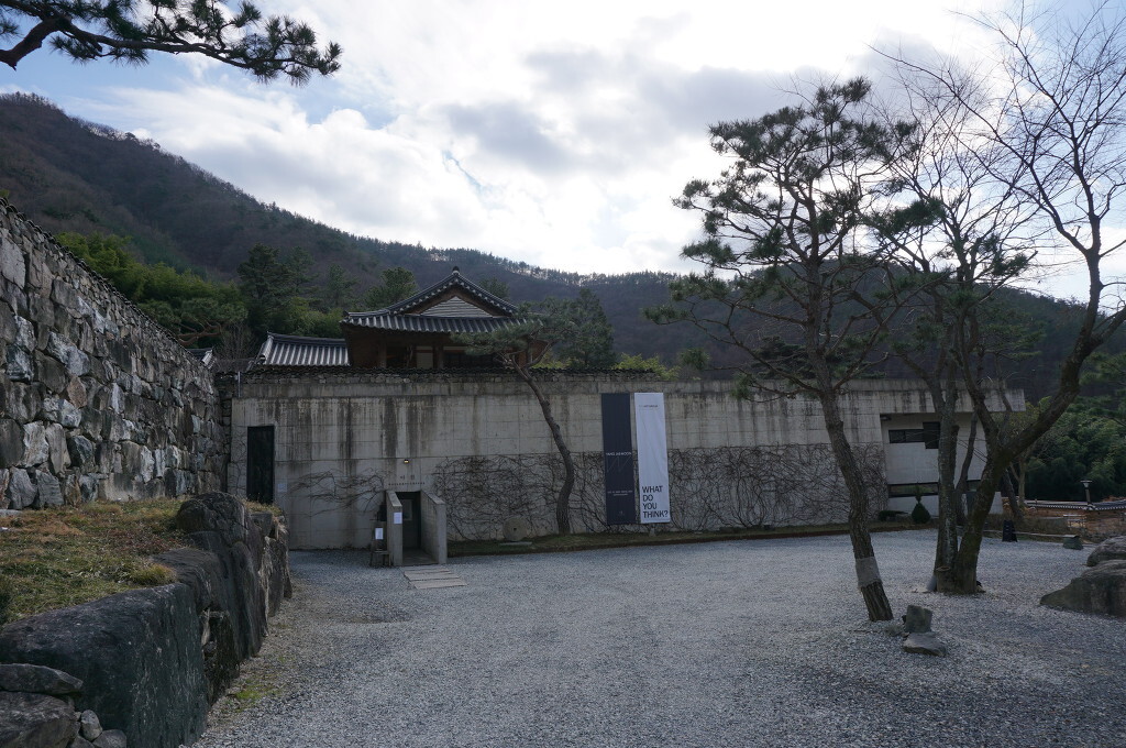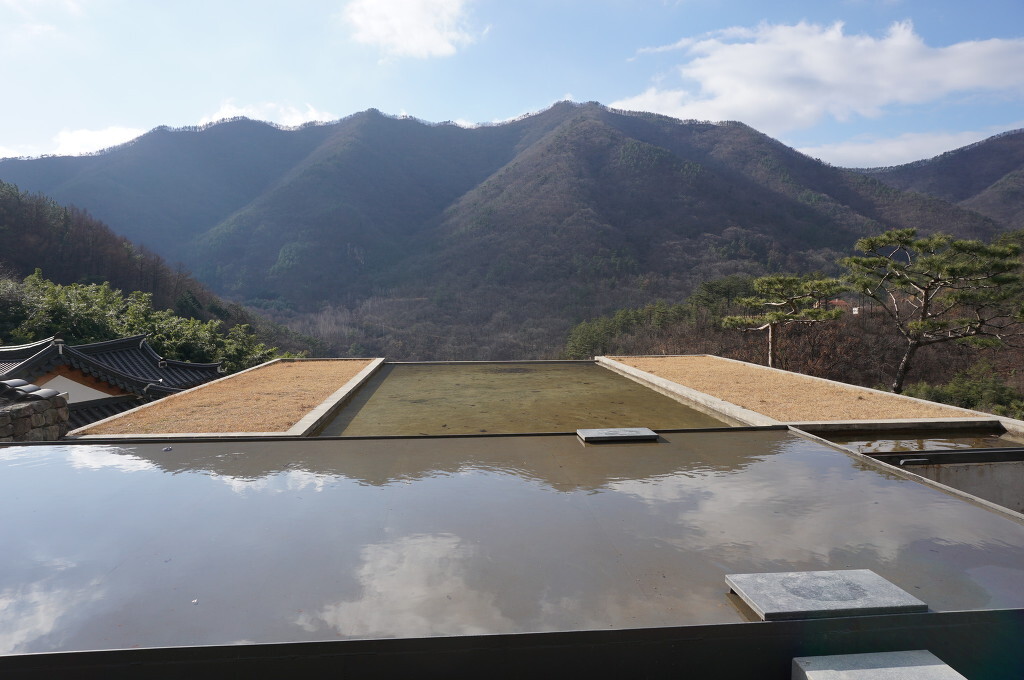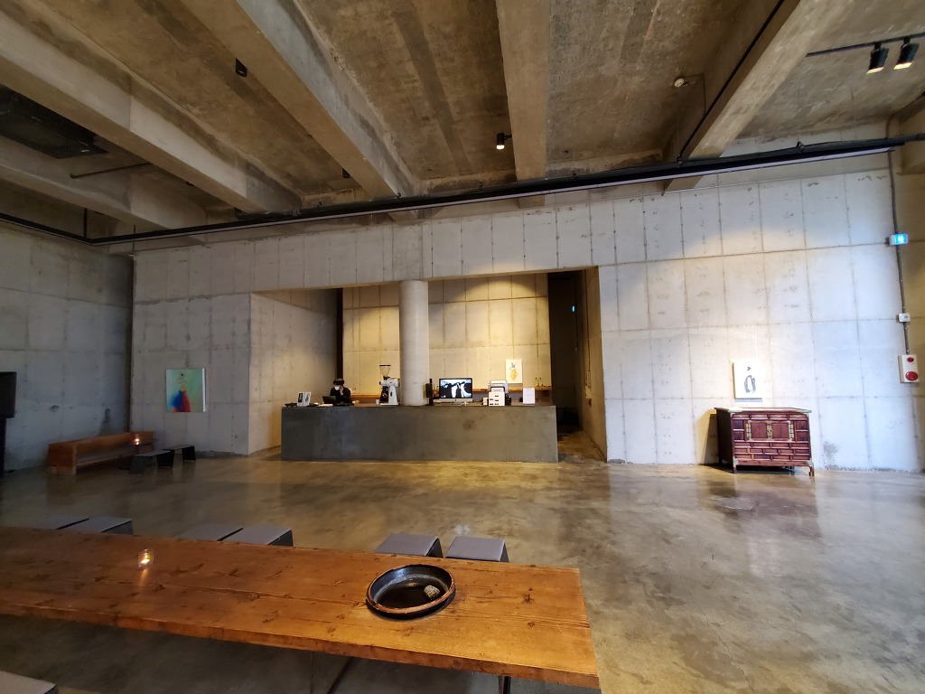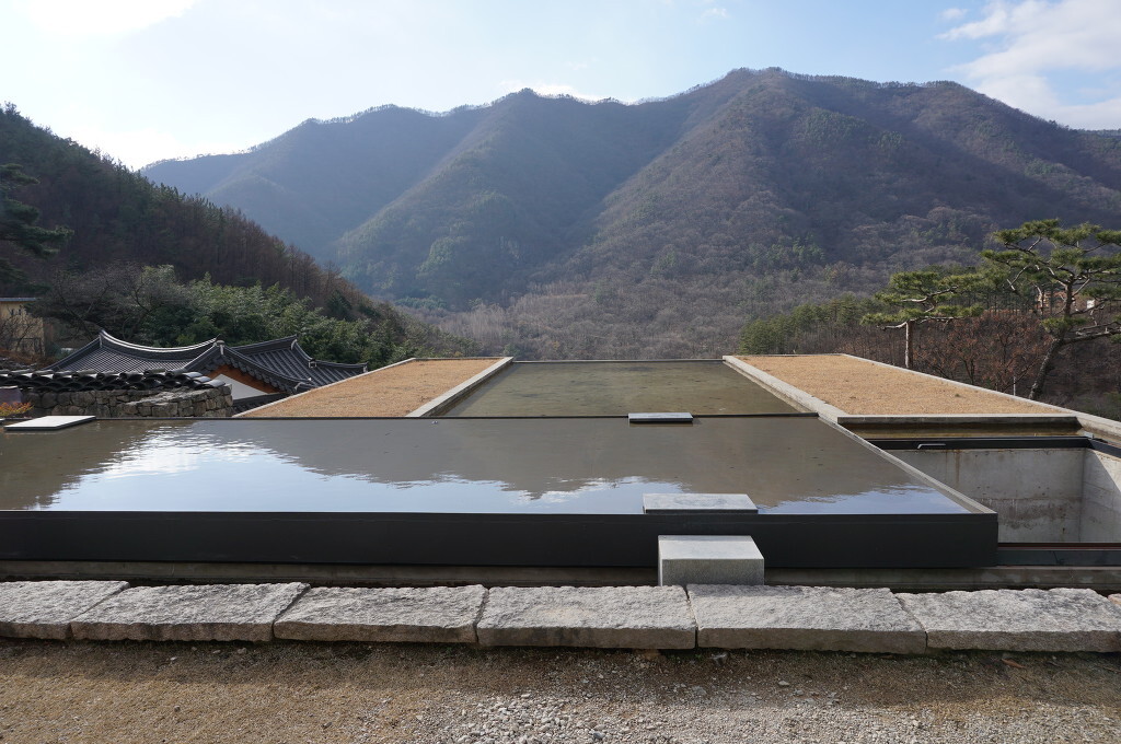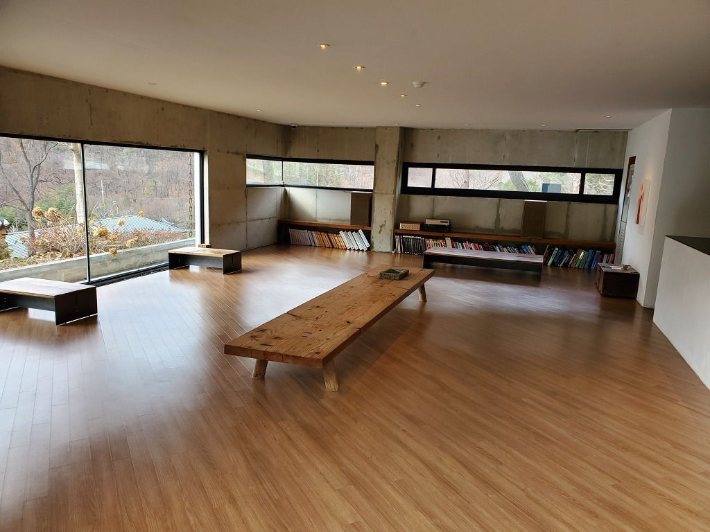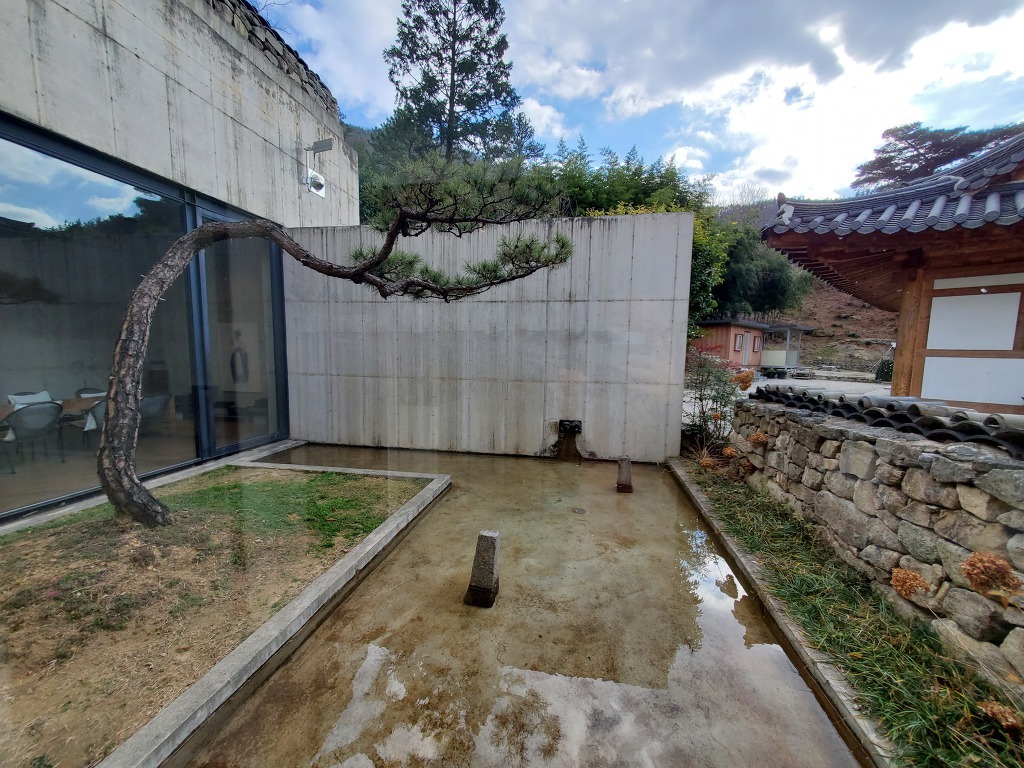 이어주는 공간으로 나무를 주재료로 지어진 한옥과는 달리 현대적인 소재인 누드 콘크리트로 지어진 미니멀한 건물이다.