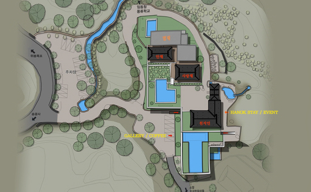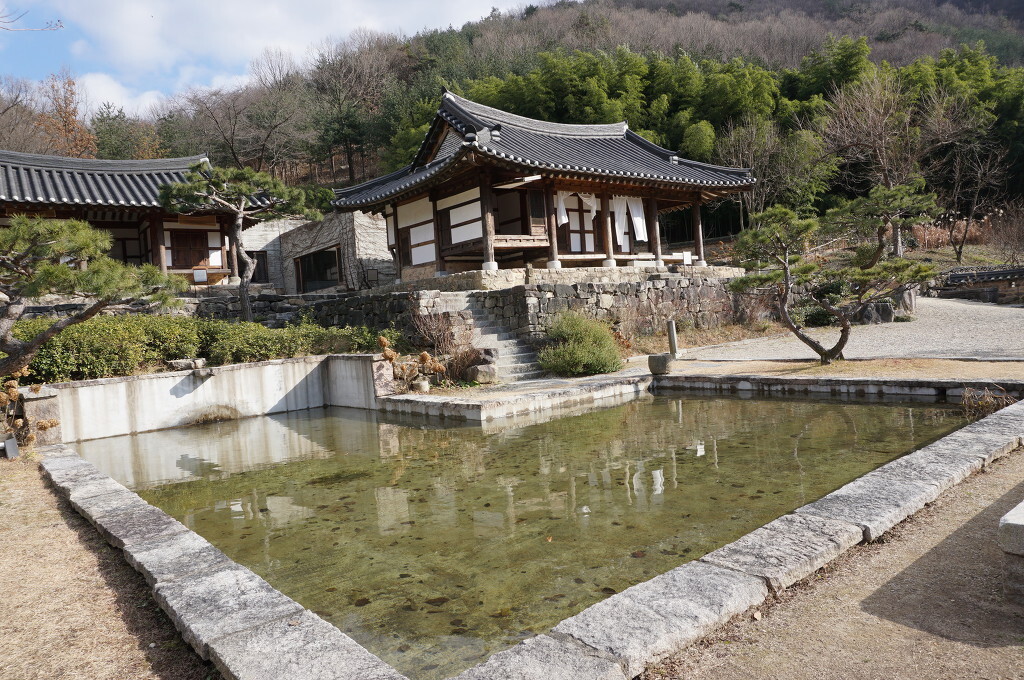택이 자리하고 있다. 산 그림자가 내려 와 쉬는 연못위의 설화(說話)당은 그 이름처럼 많은 이야기와 추억을 만들어