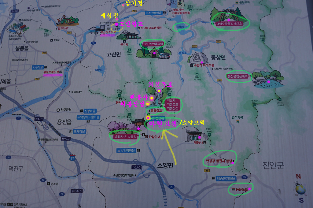 찾아가는 여행지로써 소양면에서 위봉산성을 거쳐 동상면과 고산면 대아수목원으로 이어지는 도로는 BTS 팬들에