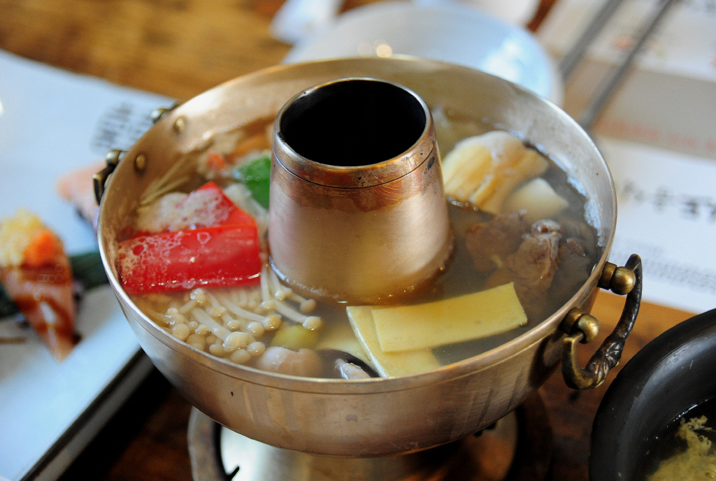 신선로는 소고기와 무로 시원한 육수를 내고 새우, 버섯, 미나리, 안심, 은행 등 다양한 재료가 들어가 있다. 국물과