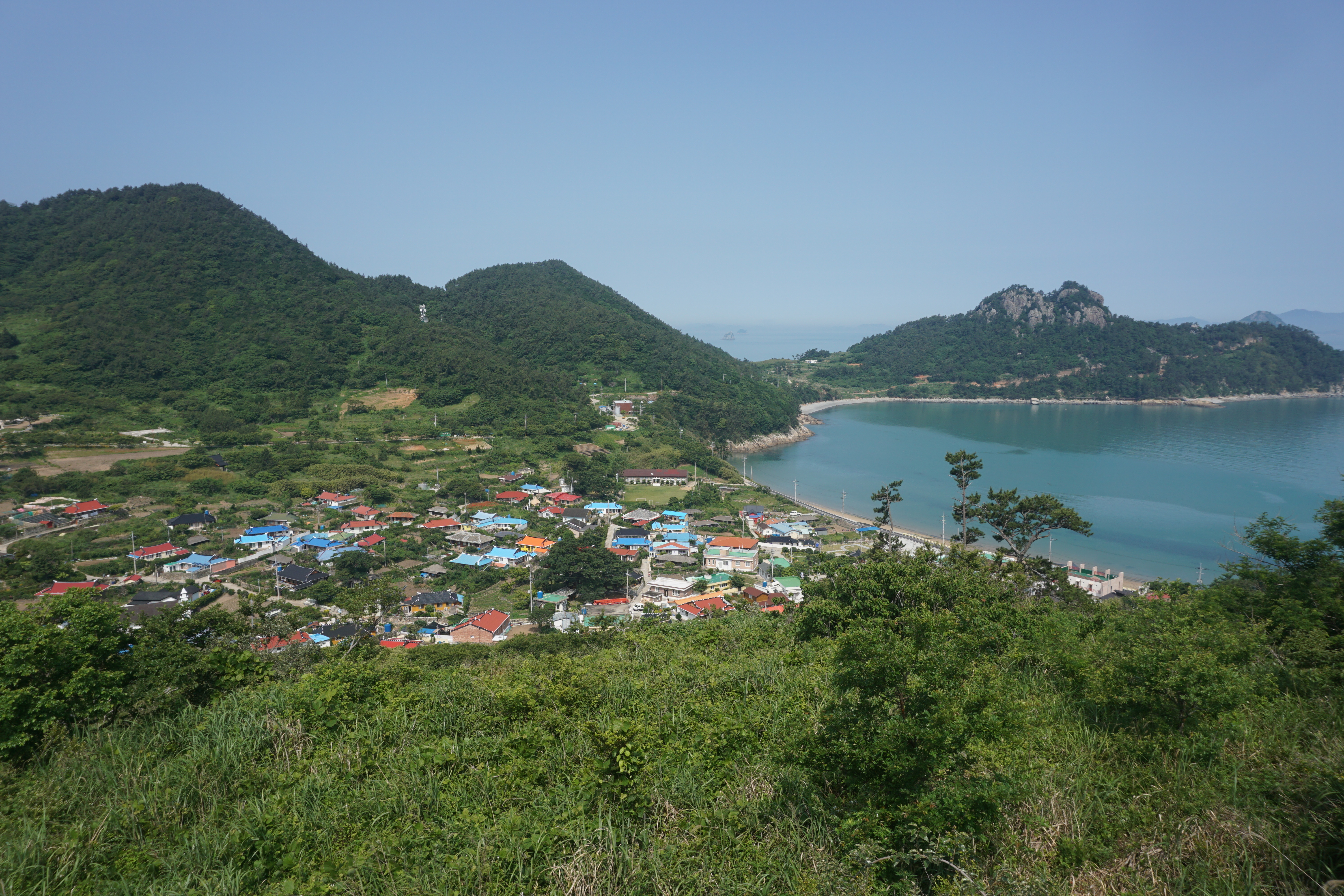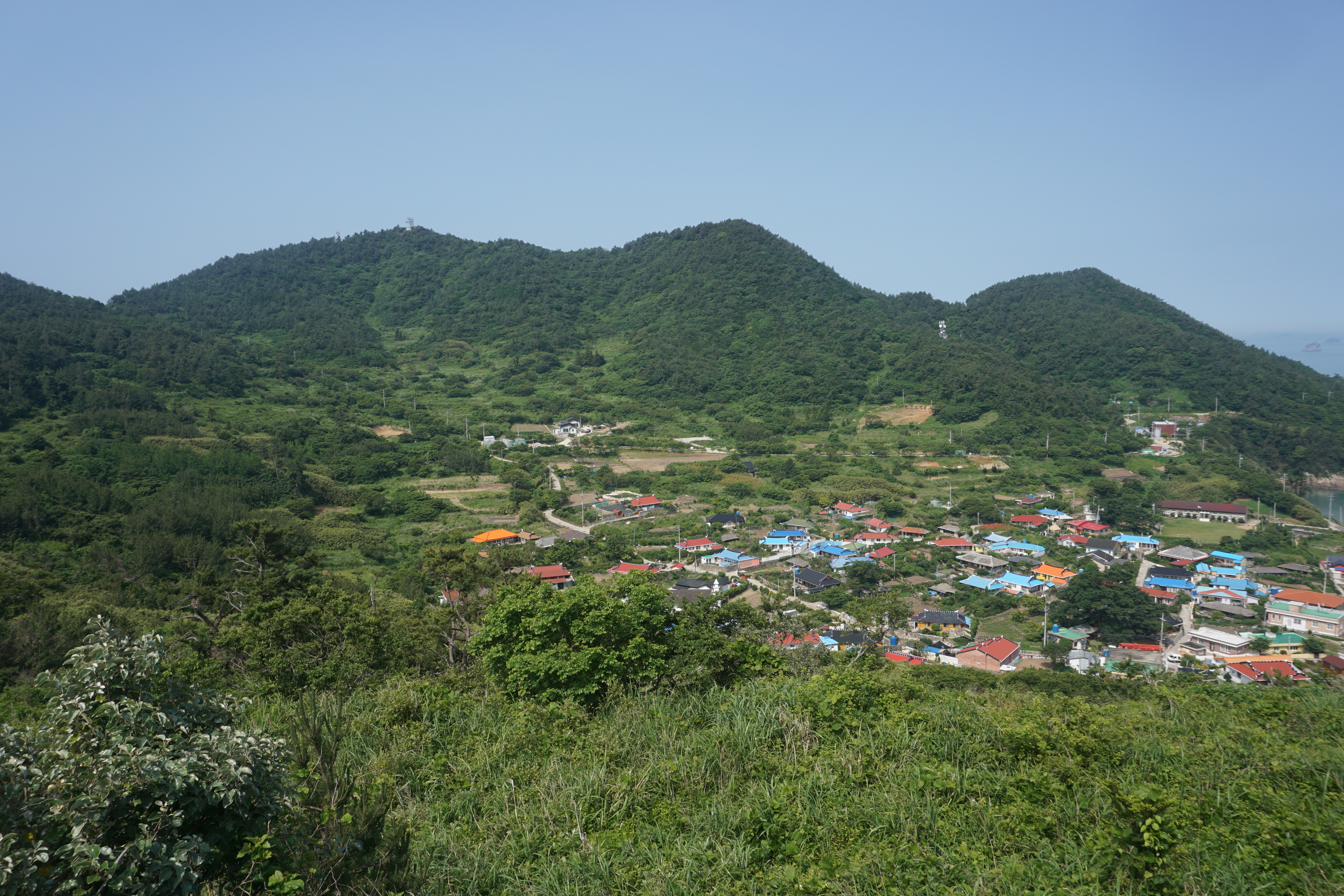 *‘손죽마을 전망대’라는 별명답게 파랑·빨강이 섞인 지붕이 옹기종기 모인 것이 한눈에 드러난다. 그 너머에 무뚝뚝한 장남 같은 육산