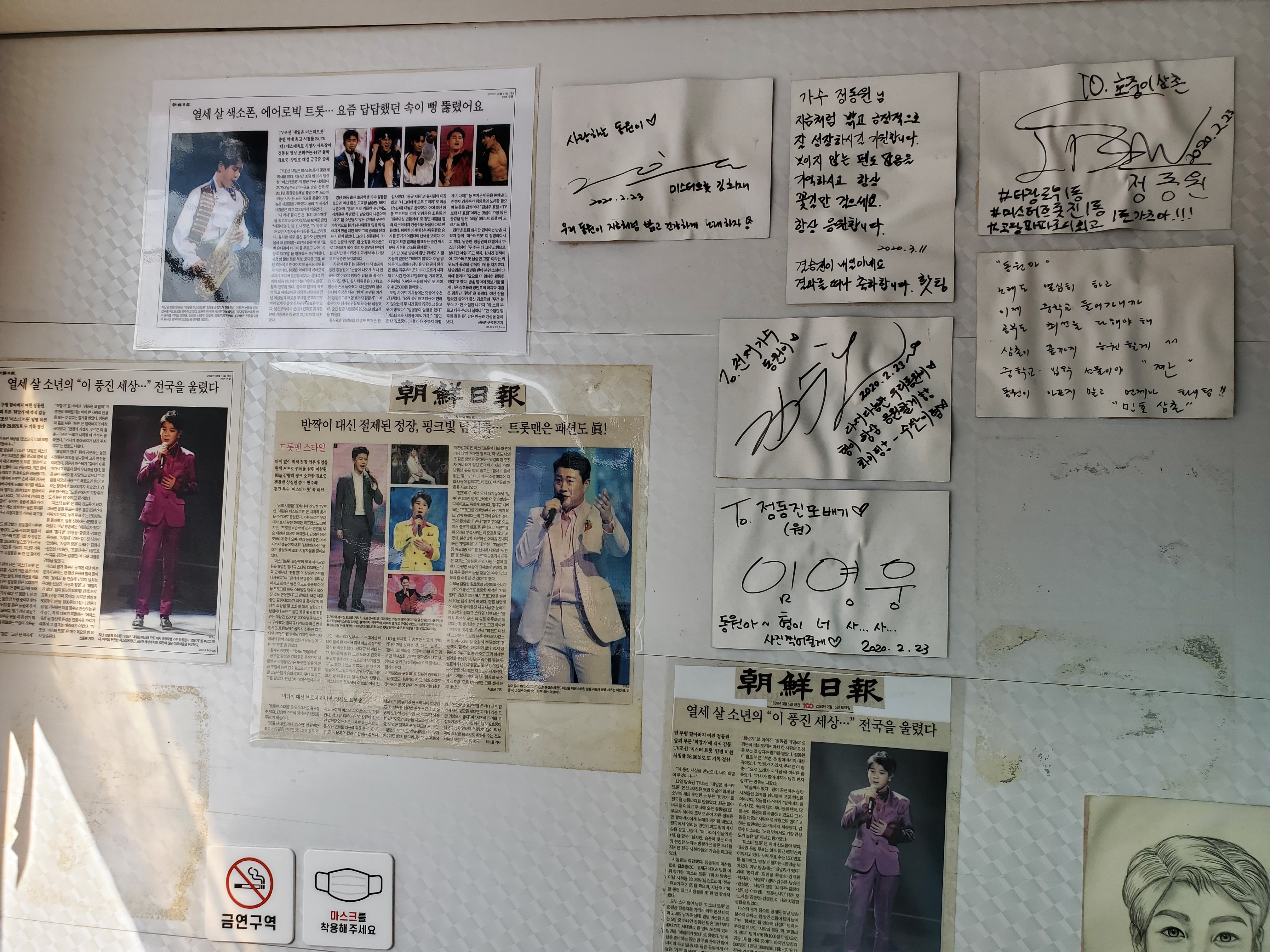 고 <미스터트롯>의 흔적들이 수두룩 하다. 임영웅, 영탁, 장민호 등 미스터트롯 수상자들의 축하 멘트와 사인