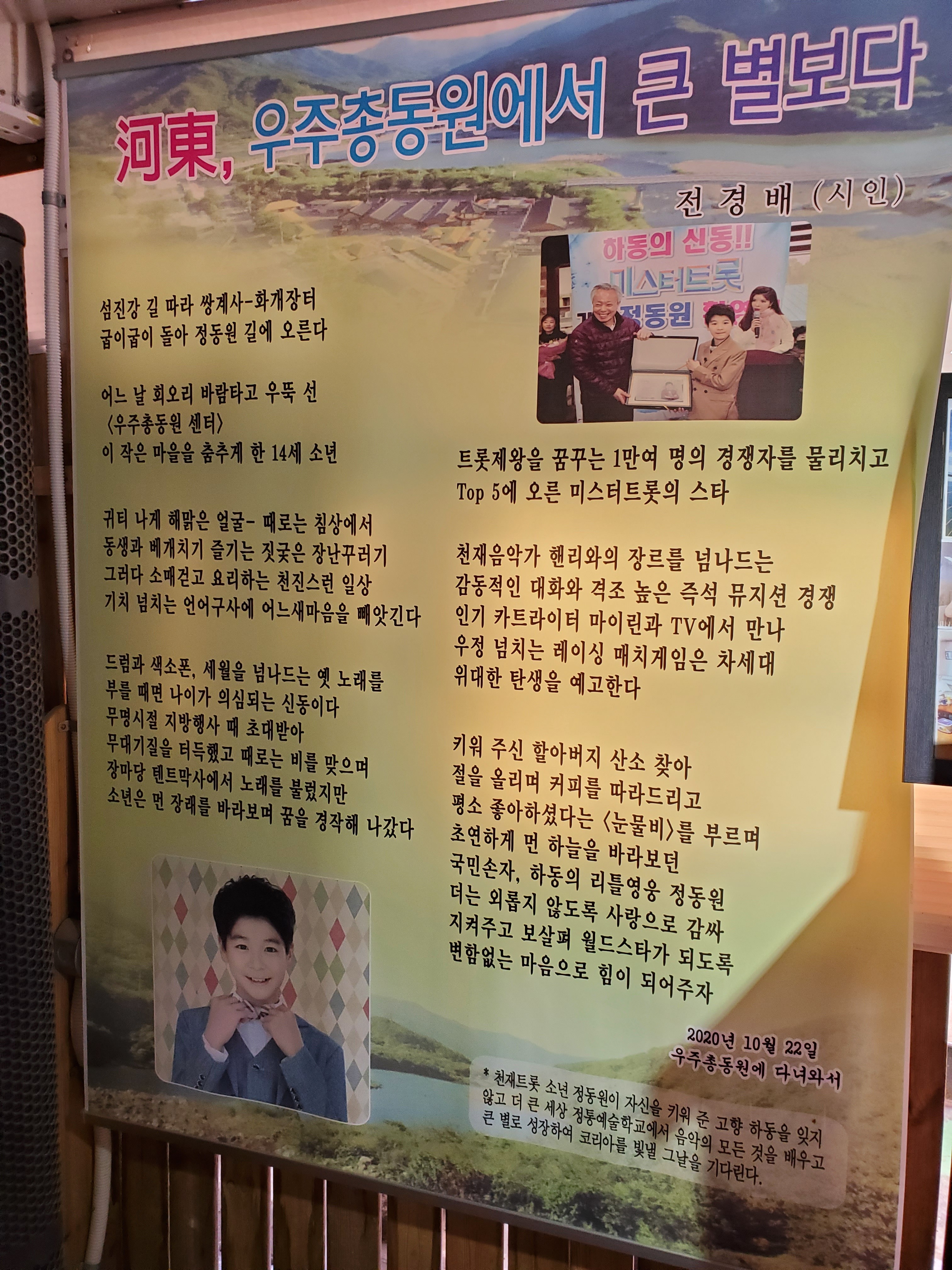정동원은 2020년 1월에 TV조선 내일은 미스터트롯에 출연했으며, 만 13세의 나이로 결승전에 진출하여 그 쟁쟁한 선배가수들을 물리치고 최종 5위를 차지했다. 그 정동원의 발자취를 따라 하동군 진교면에 위치한 일명
