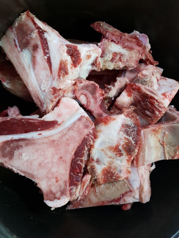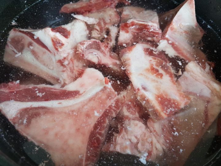 1-1. 뼈를 흐르는 물에 깨끗하게 씻고 물에 담궈 핏물을 빼줍니다. 물이 핏물로 빨개지면 물을 다시 받습니다.