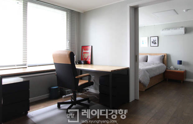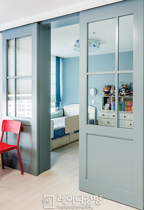 8 아이 방에 가벽을 세워 공부방과 침실을 효과적으로 분리시켰다. 가벽에는 슬라이딩 도어를 포켓식으로 시공해 문을 열어놓으면 시각적으로 훨씬 넓어 보이고 방이 하나로 이어진 느낌이 난다. by 카민디자인