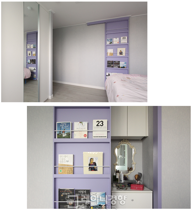4 수납과 가벽 효과 기능을 낸 똑똑한 슬라이딩 도어 시공 사례. 책을 좋아하는 딸을 위해 책을 수납할 수 있는 책장형 슬라이딩 도어를 설치하고 안에는 기존에 있던 붙박이장을 철거하는 대신 딸에게 필요한 파우더룸을 마련했다. by 카민디자인
