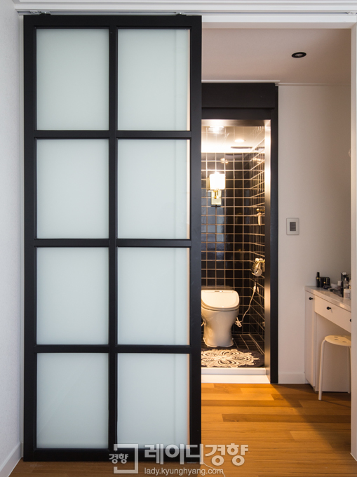 5 침실 안 남는 공간에 가벽을 세워 파우더룸을 마련했다. 가벽에는 블랙 프레임의 슬라이딩 도어를 설치했고 전체적으로 블랙&화이트로 꾸며 세련된 느낌이 난다. by 카민디자인