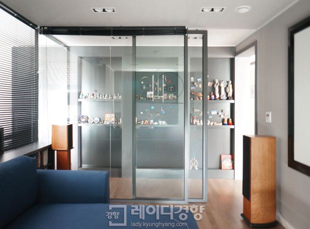 6 투명한 유리 소재 슬라이딩 도어는 문을 닫아놓아도 공간이 넓어 보이는 것이 장점. AV룸 안에 슬라이딩 도어를 설치해 공간을 분리시키면서 유리 소재로 답답해 보이지 않게 했다.