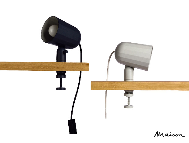 선반이나 기둥에 매달아 사용하는 조명인 ‘녹 클램프 Noc Clamp’는 알루미늄 소재를 면으로 깎아 만든 듯한 전등갓이 특징이다.
