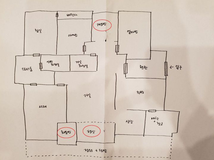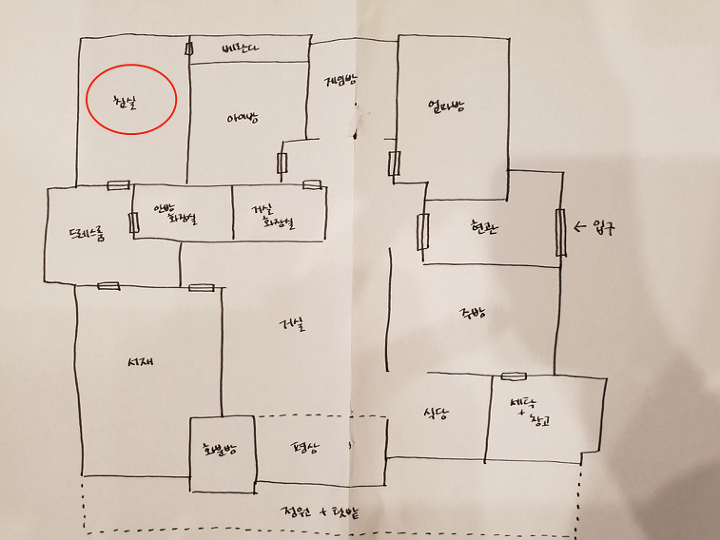 그리고 평상 뒤로는 '화분방'이 있어요. 베란다가 거실평상, 화분방, 서재책상 공간까지 연결되어 있었는데 거실과 서재는 베란다를 트면 되는데 화분방 쪽이 애매했어요.