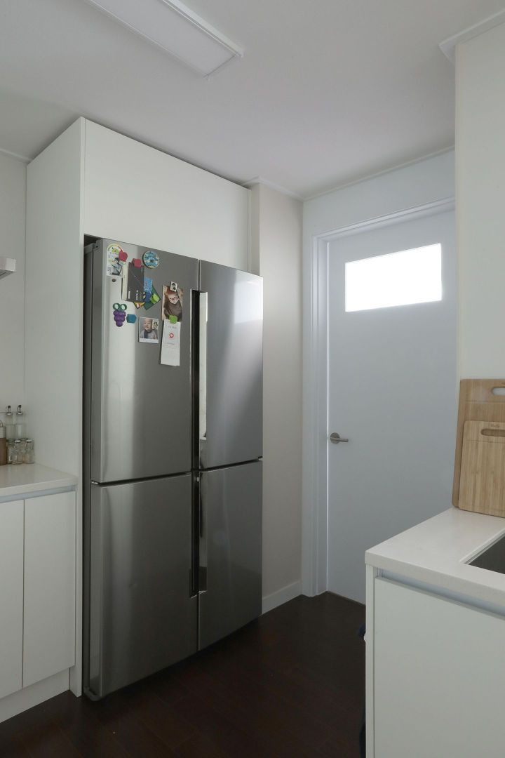 냉장고는 개수대와 인덕션 사이, 창고로 연결된 문 옆에 있어요.