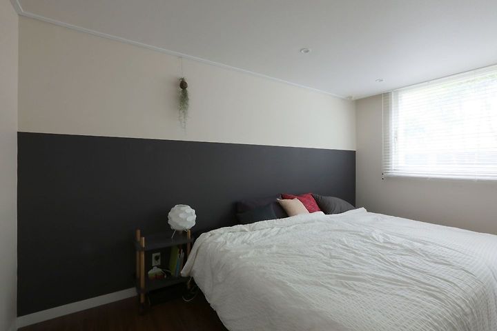 포인트 벽은 페인트가 아닌 벽지를 활용해서 투톤으로 만들었어요. (벽지로 해도 깔끔하게 잘 돼요!) 아이와 함께 자는 공간이라 퀸사이즈 침대와 슈퍼싱글 침대를 붙여서 쓰고 있어요.