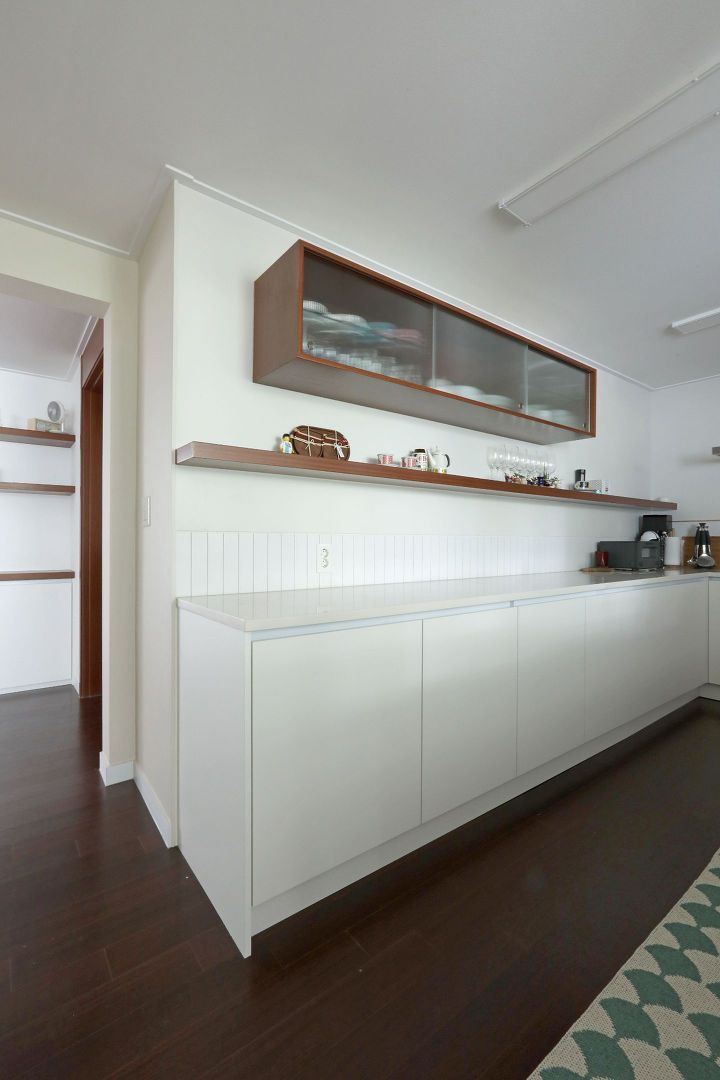 주방살림이 많지 않아서 상부장은 처음부터 생각을 안 했어요. 대신 해외 인테리어 자료에서 본 예쁜 수납장을 포인트로 달았는데 수납도 은근 잘 되고 보기에도 예뻐서 효자템으로 등극했어요.