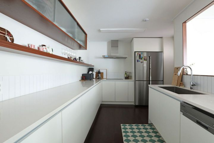 하부장 맞은 편 개수대 앞, 설거지 할 때 외롭지 말라고 뚫은 건데 식탁에서 개수대로 그릇을 쉽게 나를 수 있다는 게 더 큰 장점이랍니다! 이러려고 뚫었던가 헷갈릴 정도예요. ㅎㅎ