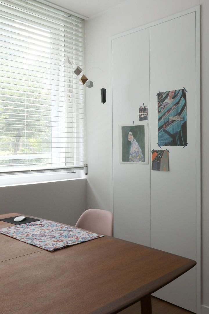 일 말고도 집에서 꼼지락 꼼지락 하는 취미가 많아서 책상 뒤에 작은 창고 공간도 만들었어요. 저기 창고엔 재봉이나 자수에 필요한 원단부터 각종 레고, 미니어처, 피규어 등이 가득하죠. 아이가 발견하면 난리가 날 게 분명해서 열기 어렵게 일부러 손잡이도 안 달았어요.
