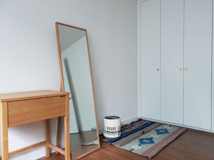 먼지가 들어가지 않도록 열고 닫을 수 있는 화장대와 전신거울은 원목 제품으로 두었고, 수납은 붙박이장으로 해결하고 있습니다.