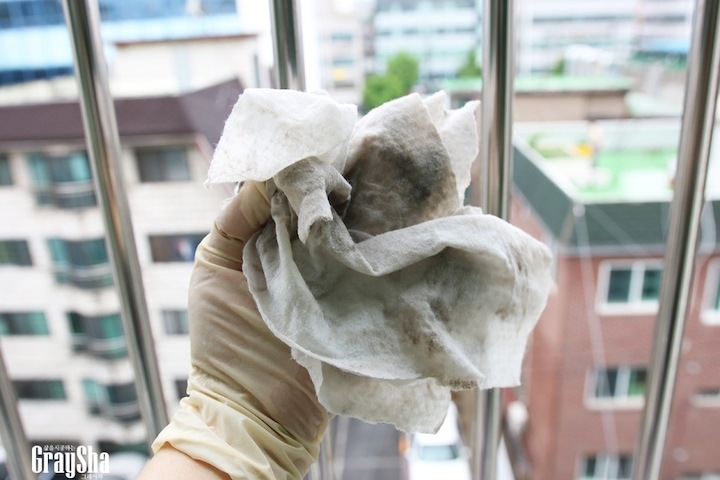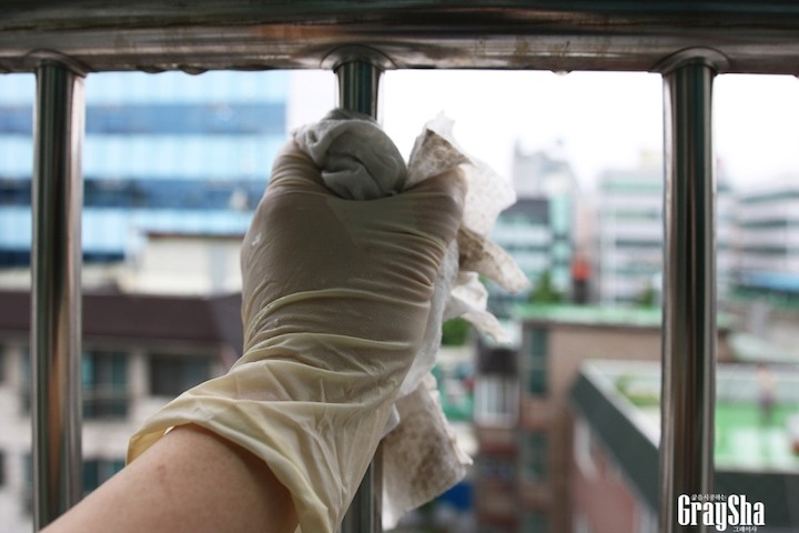 손이 닿는 선까지 난간도 닦았는데 말도 못 하게 더럽더라고요. 이게 다 날라서 안으로 들어오는 거잖아요. 그래도 종종 닦아 주는 곳인데도 심하더라고요.