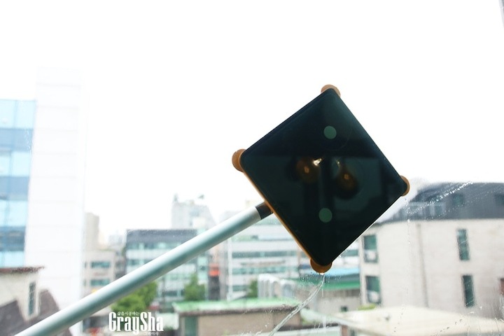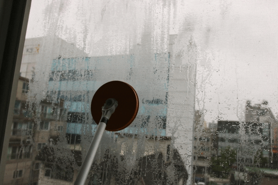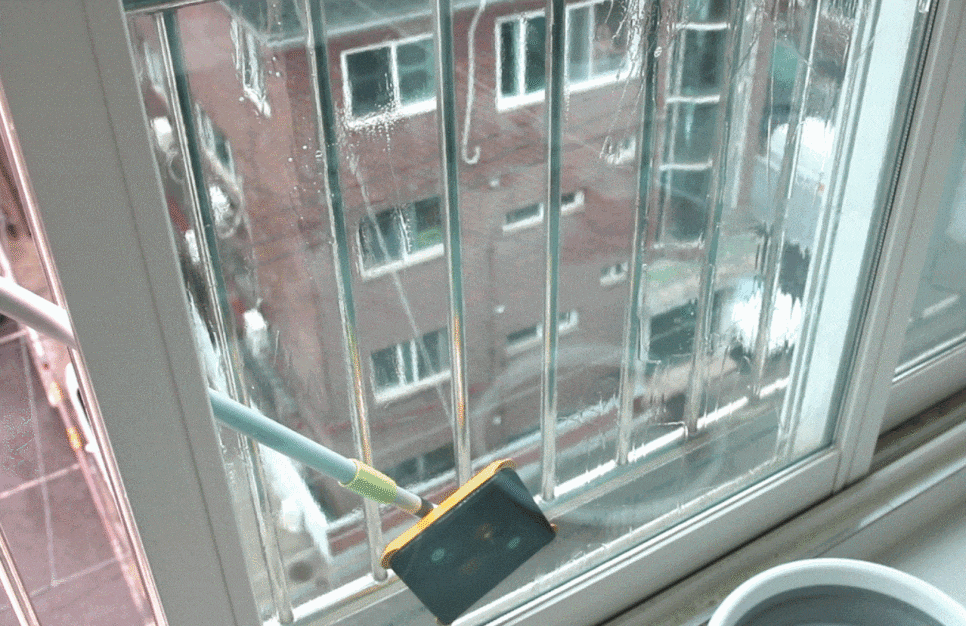 밀대를 세제 물이 적시고 유리창에 붙인 후 문지르면 돼요. 이때 고무 패킹이 압착돼서 떨어지지 않아요.