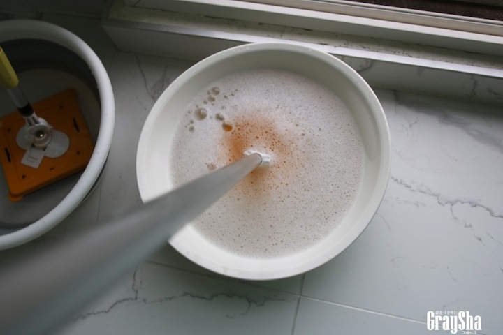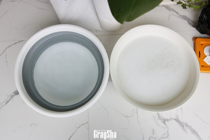 그리고 물이 담긴 세숫대야도 두 개 준비했는데요. 하나는 주방 세제(5방울) 조금 섞은 세척용 그리고 물 하나는 헹굼용으로 사용할거랍니다.