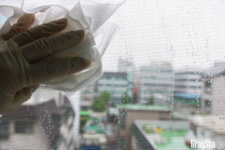 2번 정도 하고 난 다음에는 물티슈 2장으로 닦아줬는데요. 미세 망으로 되어 있어 잘 닦기가 힘든데 물티슈가 행주보다 잘 닦여서 계속 그렇게 쓰고 있어요. 그리고 빨아서 쓰면 되니까 다 끝날 때까지 2장이면 되지요. 닦다 보면 오염이 묻어 나오는 것이 보이다 보니 꼭 하지 않아도 상관없는 과정이지만 자꾸 하게 되는 것 같아요. 또한 베란다 유리창 외부를 닦을 때는 물난리가 나니까 같이 하는 것이 편해요. 그래야 여러 번 치우지 않고 한번에 끝낼 수가 있어요.