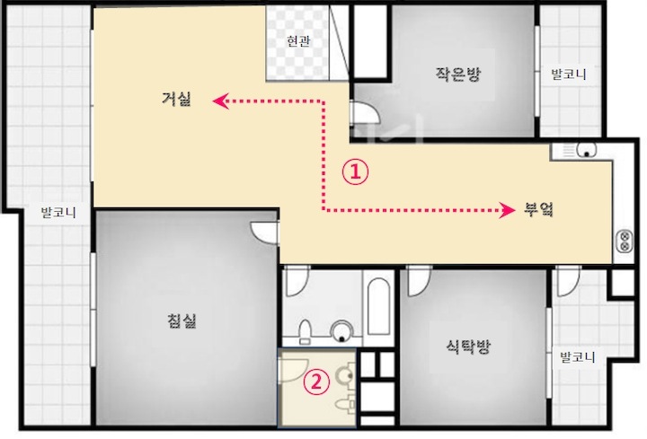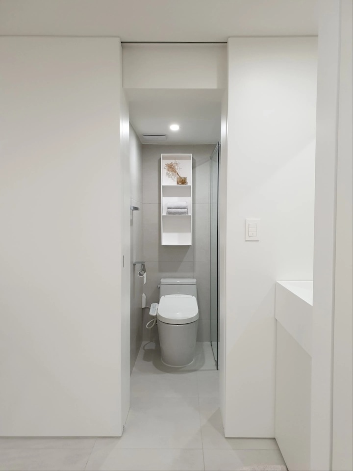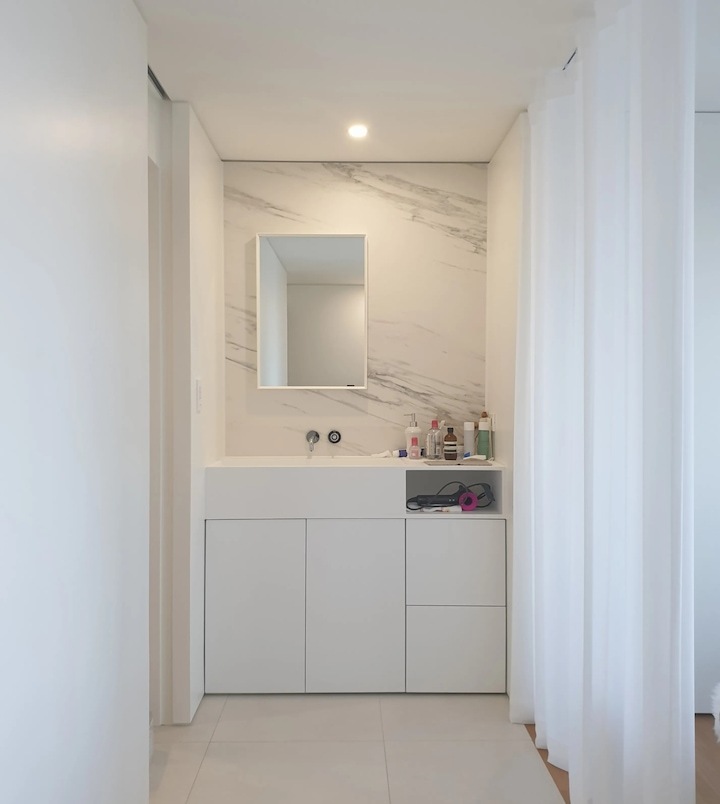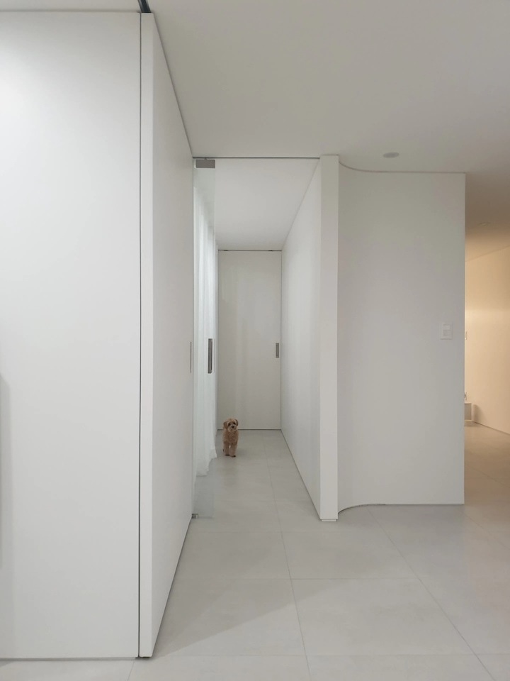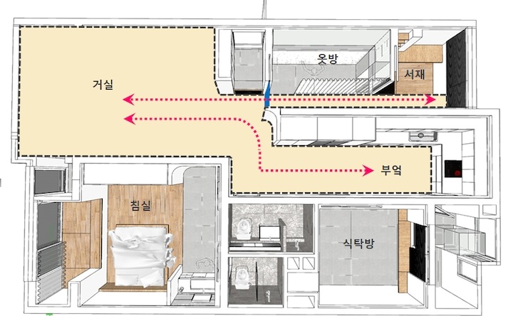 우리 부부는 닮은 얼굴처럼 같은 학교에서 건축을 전공하고, 둘 다 너무나 설계를 사랑하였지만 지금은 현실적인 이유들로 설계와는 많이 거리가 있는 부동산 관련업에 종사하고 있습니다. 비록 우리 부부의 현재 현실은 그렇지만! 마음 깊숙히 항상!! 건축가에 대한 꿈, 대학시절 집, 공간에 대해 생각하곤 했던 시간들에 대한 그리움을 갖고 있었습니다. 앞으로 소개해드릴 첫 신혼집은 이러한 그리움 꾹꾹 담아 정말 열정적으로 꾸민 집입니다. 지금 생각해도 공사 시작 2달 전부터 아파트 도면을 들고 다니며 남편과 이리저리 아이디어를 공유하면서 굉장히 행복했습니다❤ 20년 구축 32평 아파트의 전형적인 한계 ① 꺾인 거실 공간 ② 좁은 침실 욕실 인테리어 전, 집 평면입니다. 이 집은 2000년대 초에 지어진 정말 "전형적"인 32평 구축 아파트입니다. 90년대 말부터 2000년대 초반까지 상당히 많은 아파트들이 저희 집과 동일한 구조로 지어져있다고 해요! 우리 부부가 가장 큰 단점으로 생각했던 두 가지는 ① 거실과 부엌 연결이 꺾여있어서 거실이 좁고 답답해 보인다는 점, ② 침실(안방) 욕실이 매~우 좁다는 점이였습니다. 이 두 가지 한계를 집중적으로 정말 연구하듯이 열심히 해결해보려고 했는데, 저희는 정말 후회 없이 잘 했다고 생각합니다. 두 가지를 중점적으로 먼저 전체적인 저희 집 구조에 대해 소개해드리겠습니다~ ① 꺾인 거실 공간을 갤러리처럼 ! 투명 유리 문과 중문,부엌을 곡선 벽으로 연결하여 갤러리처럼 기존에 꺾인 거실과 부엌 사이 공간을 색다른 느낌으로 펑 트이게 만들고자, 작은방의 공간 일부를 복도 공간으로 변경하였습니다. 현관에서 작은방으로 들어가는 문을 슬리이딩 유리 문으로 변경, 거실에서 복도 끝까지 볼 수 있어 거실 공간이 확장된 효과를 냈습니다. 거실에 TV만 설치했을 때 모습입니다. 작은방 복도와 부엌이 함께 보여 공사 전보다 공간 트인 느낌이 듭니다! 갤러리 느낌을 최대한 주기 위해 내부 조명을 최소화하였으며 집 전체를 페인트로 칠해 미니멀하고 깨끗한 느낌이 들게 하였습니다. 중문, 중문 라인과 연결된 커튼, 유리 문(오픈), 곡선 벽이 어우러진 모습이에요!! 여기서 디자인 포인트는 중문이 닫혔을 때의 라인과 옷방과 복도를 구획하는 커튼 라인을 일치시켜 공간이 쭉 나아간 느낌이 들게 한 것입니다! 제가 우리 집에서 가장 엣지 있다고 자부하는 부분이기도 합니다~ 이렇게 새로 탄생한 생긴 복도 끝에서 거실(확장) 끝까지 총 길이가 약 12m 정도 되어, 보리가 자주 뛰어노는 직선 공간이 되었습니다! 옷방으로 들어가는 유리 문이 닫히고, 서재 문은 열린 상태입니다. 거실 소파에 앉아서 바라보고 있으면 시야가 펑 트여 더 넓어진 효과가 있습니다. 이번에는 반대로 서재(작은방 끝)에서 바라본 거실의 모습입니다. 12m 깊이가 생각보다 길죠? 어찌 보면 이 복도가 공간 낭비일 수 도 있지만, 거실에서 옷방을 거치지 않고 바로 서재로 갈 수도 있는 활용도 있고 재미있는 공간이랍니다~ ② 협소한 침실(안방) 화장실을 호텔처럼! 침실(안방)에 딸린 작은 화장실은 정~~말 생각보다 작아서 샤워기?, 변기? 둘 중에 하나를 포기해야 하나 깊은 고민에 빠졌었습니다. 결과는! 세면대를 화장대 겸 건식으로 외부로 빼내고, 기존 화장실 공간에 샤워부스와 변기만 두어 외국 호텔처럼 세면대와 화장실 공간을 분리했습니다. 특히 건축가님께서 레진으로 거울과 세면대를 세트로 해주셔서 정말 심플하고 고급스러운 화장대 겸 세면대가 되었습니다. 화장실 문은 슬라딩 도어로 하였고, 수납장까지 레진으로 해서 통일감을 주었습니다. 위 사진에서 오른쪽이 전에 소개해드린 건식 세면대 입니다. 침실 화장실이 워낙 협소하다보니 공간을 넓어보이게하기 위해 바닥 벽 타일을 안방과 동일하게하였습니다. 탁월한 선택이였고 미니멀하고 넓어보이는 효과를 얻었습니다! 우리 집을 디자인할 때 구조적으로 가장 많이 변경된 부분을 말씀드렸는데요, 이제는 멀리서 보면 갤러리처럼 미니멀하지 만 가까이서 보면 따뜻한 모습을 보여드리겠습니다 |