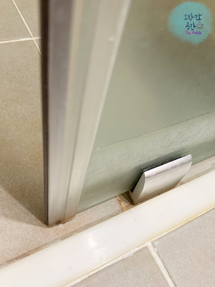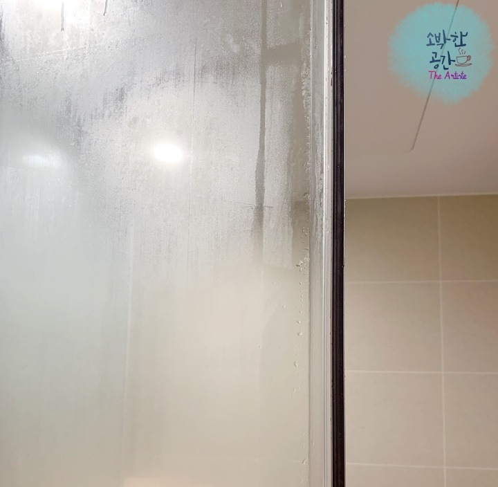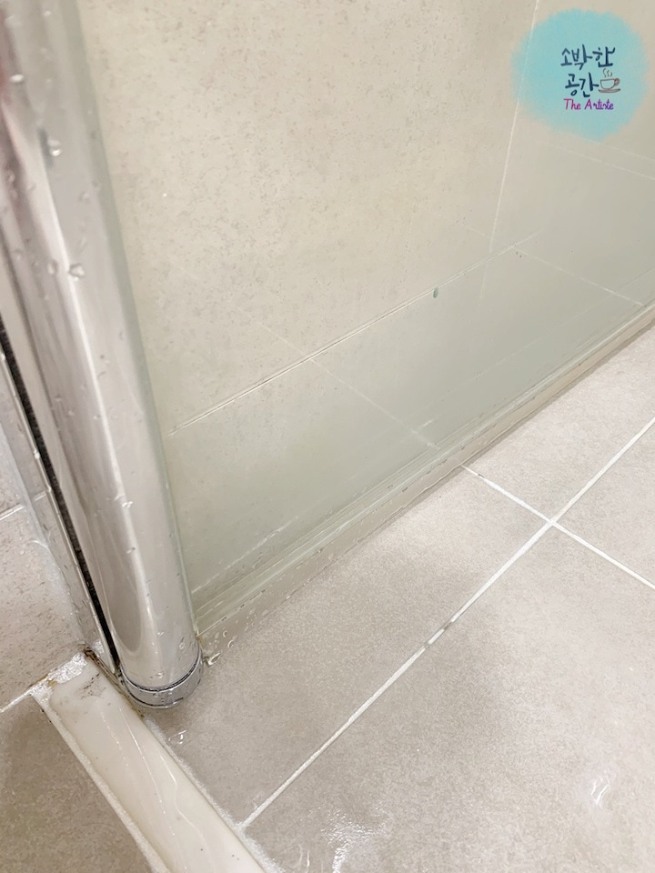 욕실 바닥 타일과 타일 사이, 욕실 바닥과 유리문 사이 쌓이는 물때는 바로바로 제거하지 않으면 눈에 거슬릴 정도로 보기 싫어요.