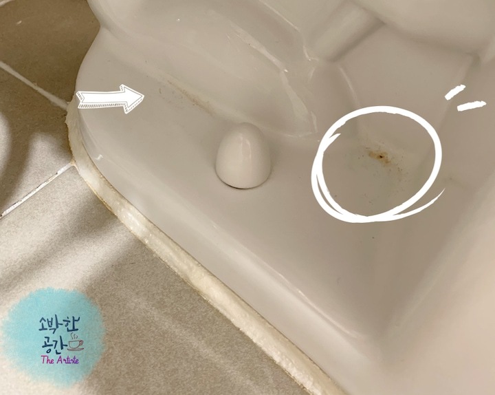 바닥 청소하다 보면 분명 보게 되는 것이 있어요. 변기 아래 부분이지요! 요기 요기! 바닥 청소하면서 같이 청소해 주세요.